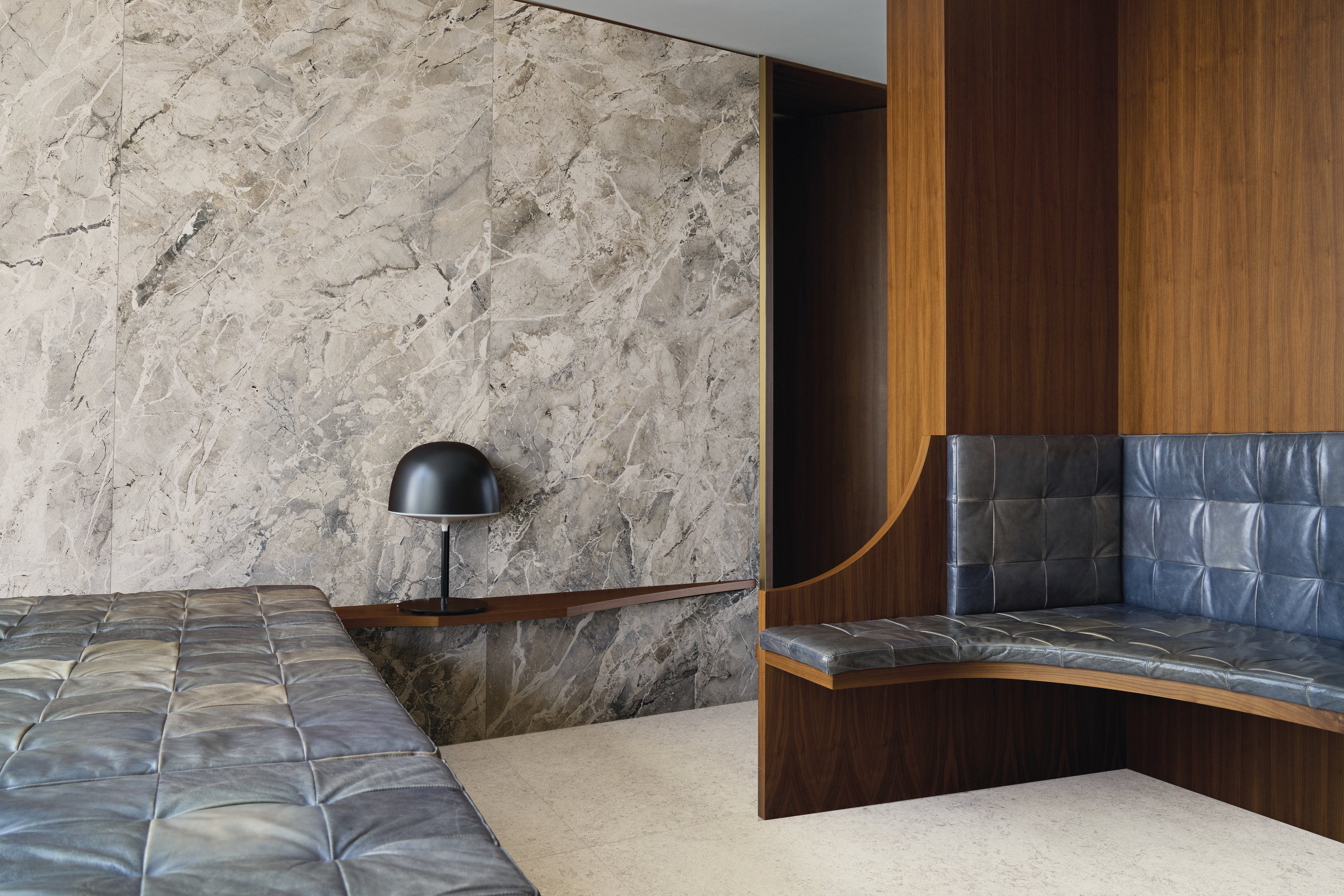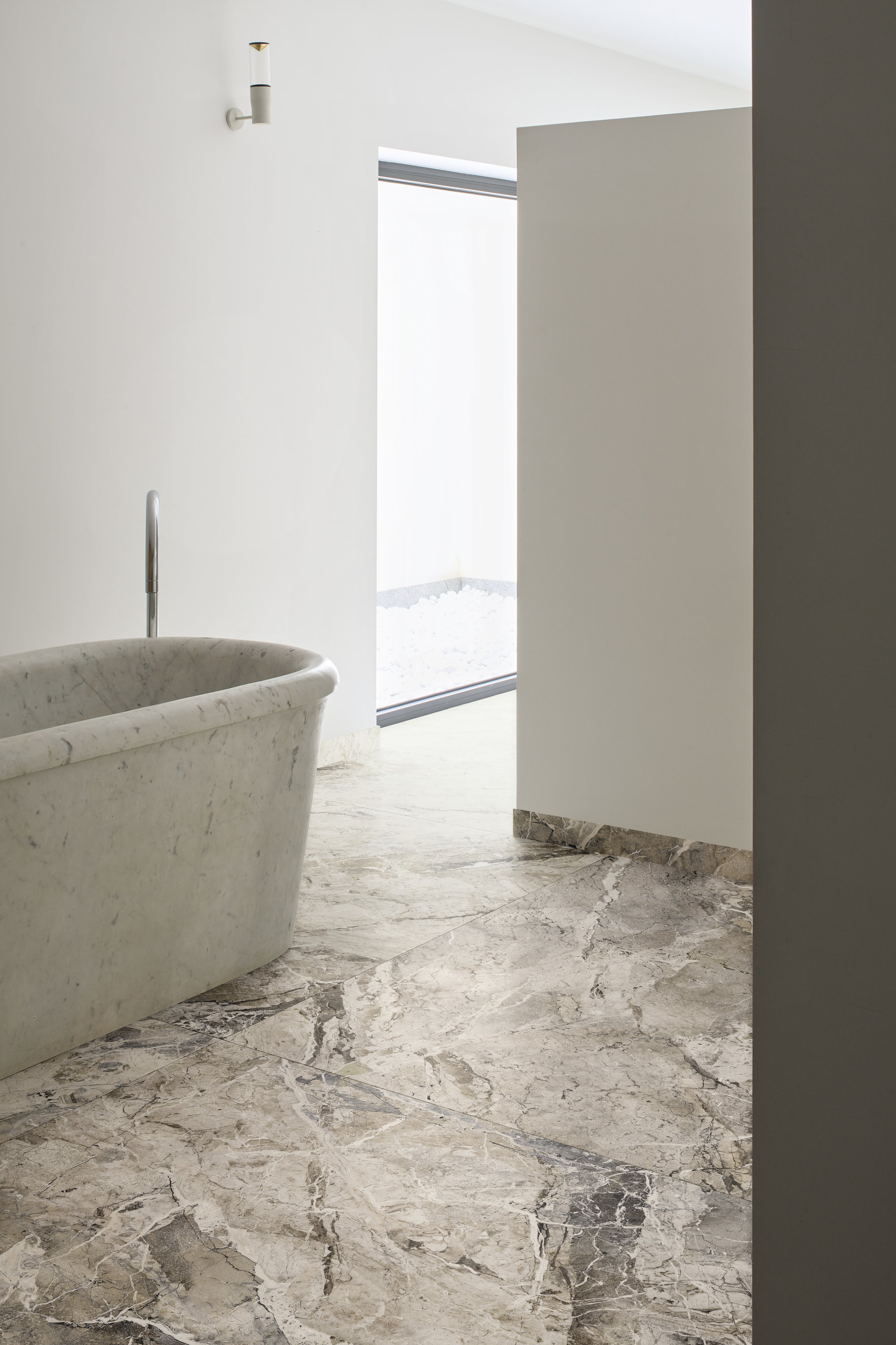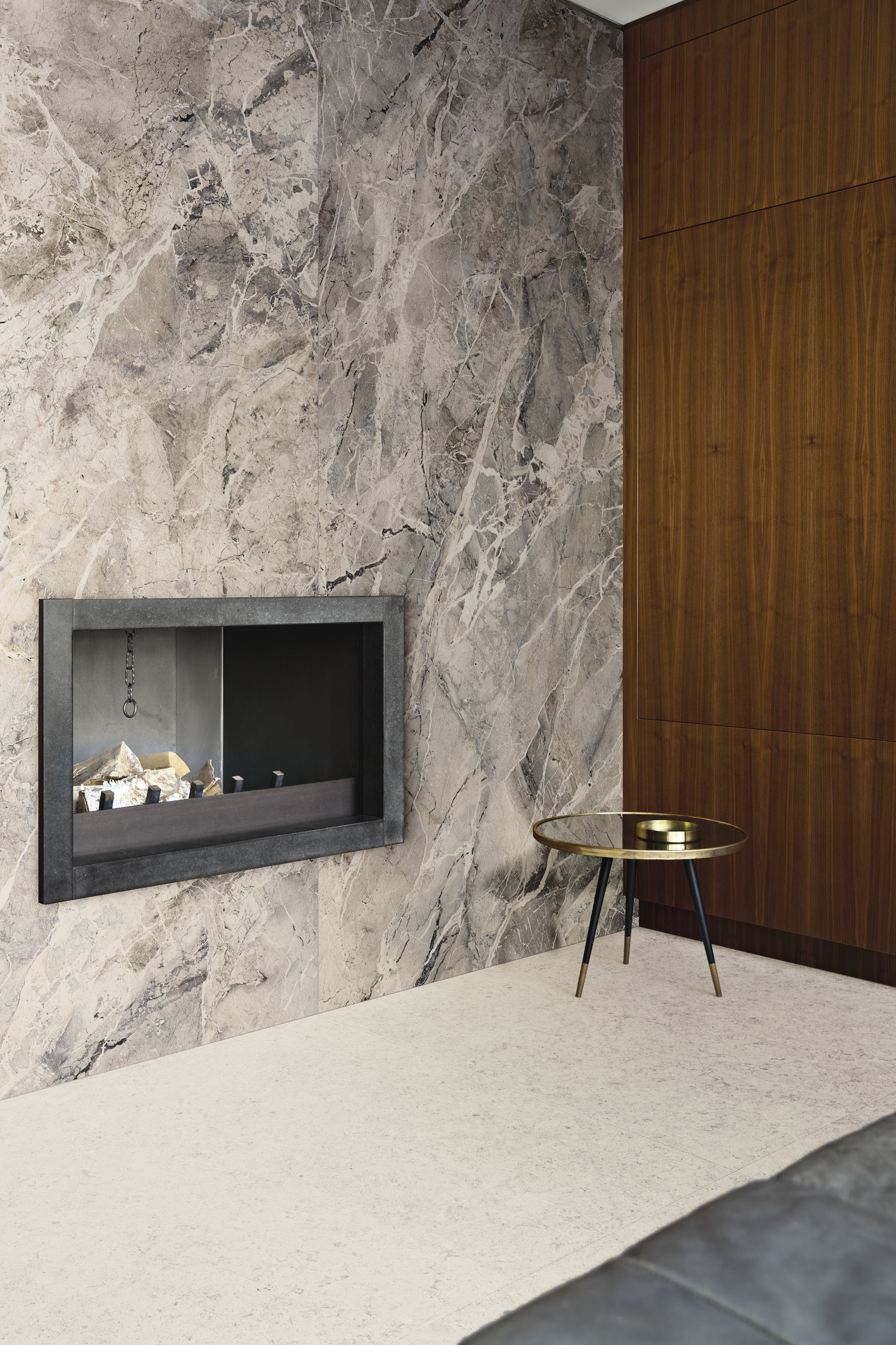 Szenografisches Material, das die Anmutung natürlicher Brekzien an die Oberfläche bringt, mit einem Hintergrund in Blau- und Grautönen, durchzogen von hellen Fragmenten und unregelmäßigen Variationen. Es ist eine Oberfläche, die nicht unbemerkt bleibt, perfekt, um Blickpunkte oder raffinierte Atmosphären zu schaffen. Die Oberflächen Natural und Natural Plus betonen den Reichtum des Designs, während die Großformate bis zu 270×120 cm die visuelle Kontinuität verstärken und Breccia Blu in ein Material verwandeln, das mit der Ausdruckskraft des edelsten Steins Räume gestaltet. Die Großplatte Breccia Blu wird mit revolutionärer wasserbasierter Technologie hergestellt. Eine absolute Neuheit für die Branche, die ökologische Nachhaltigkeit mit höchster ästhetischer Qualität verbindet.