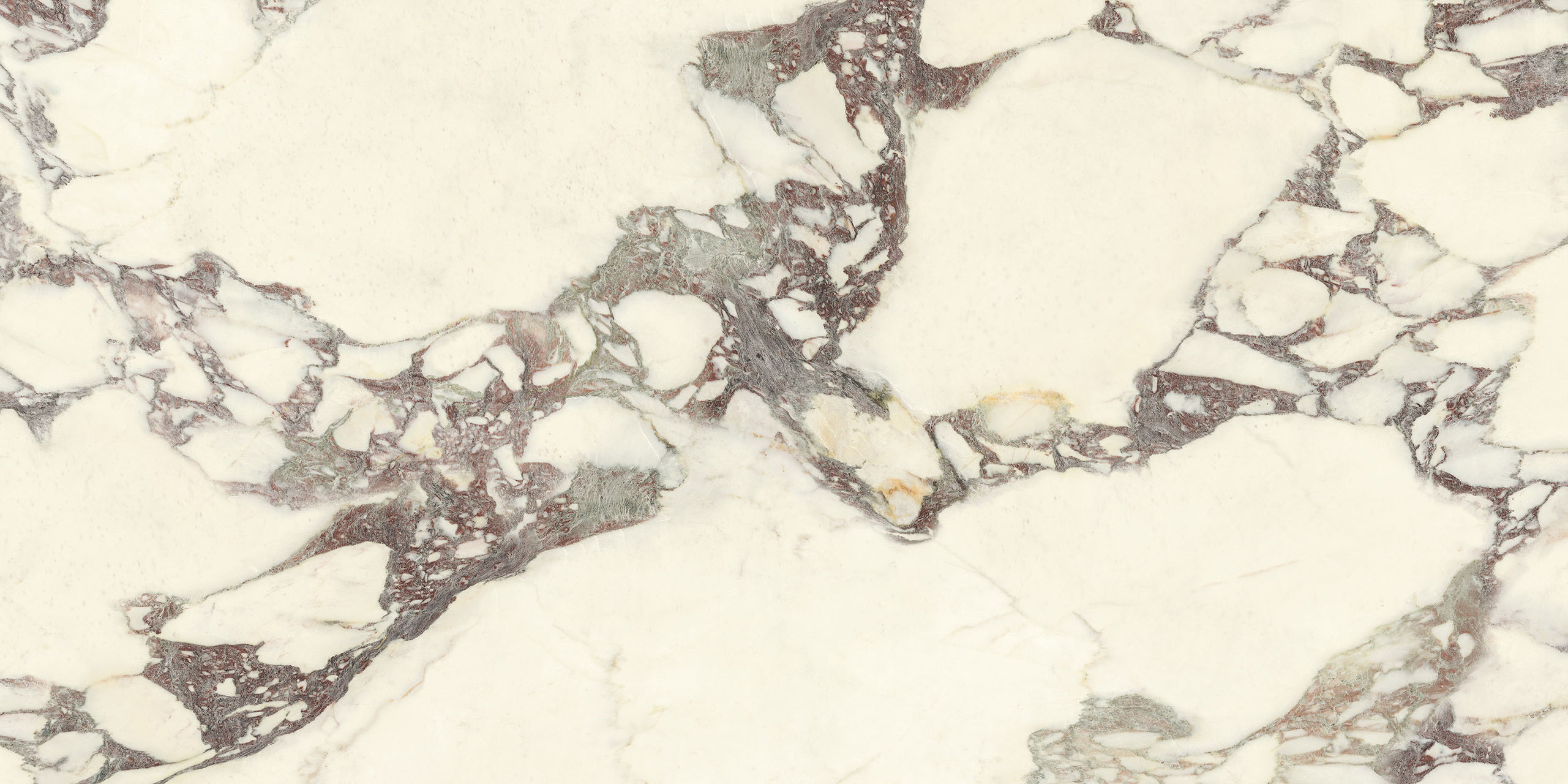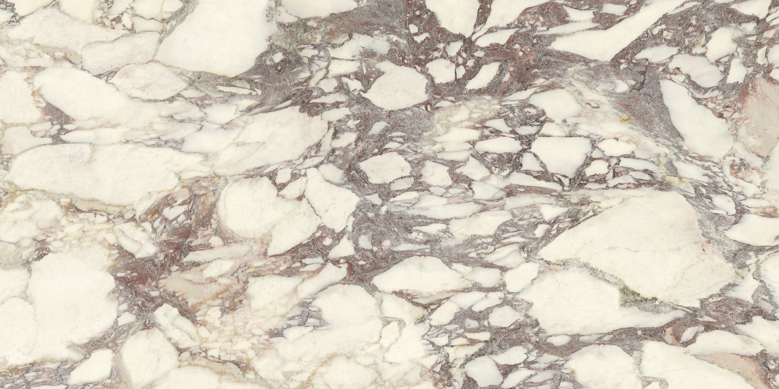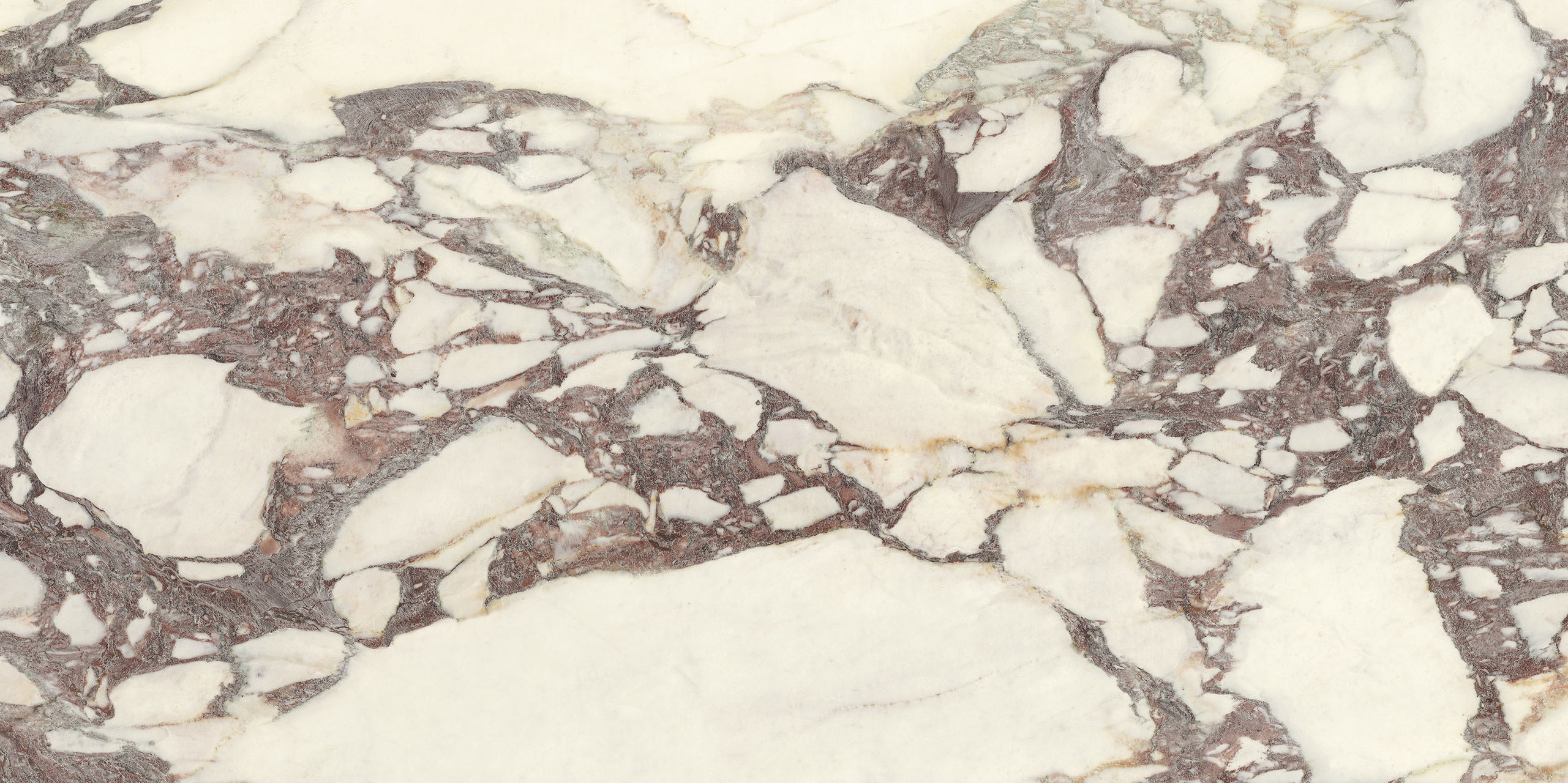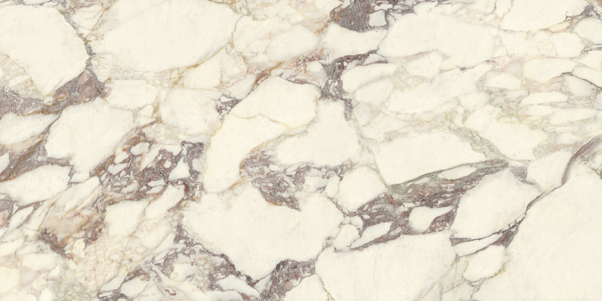 Die weitmasrige Struktur und ihr edler Charakter erinnern an antiken Glanz. Der Bindemittel in klassischen violetten Tönen zeichnet frei geformte Muster auf den warmen weißen Hintergrund, während grüne oder rosafarbene Nuancen fast goldene Akzente erhalten. Die Polychromie ist perfekt vollendet. Erhältlich in klassischen und Maximum-Formaten.