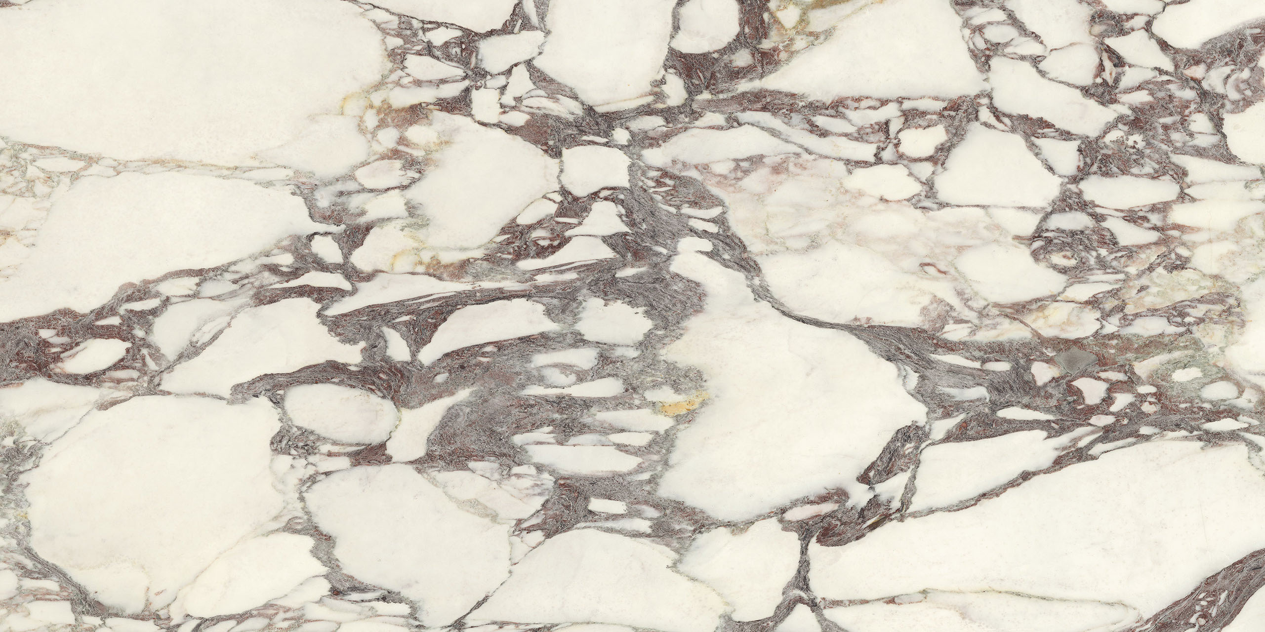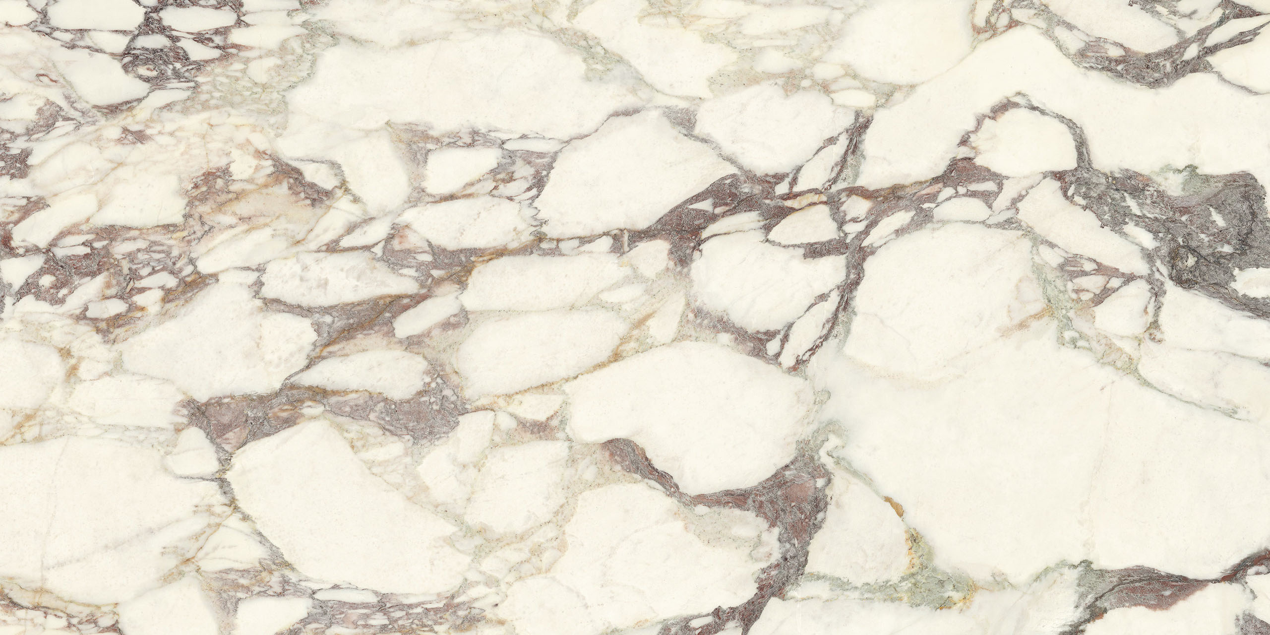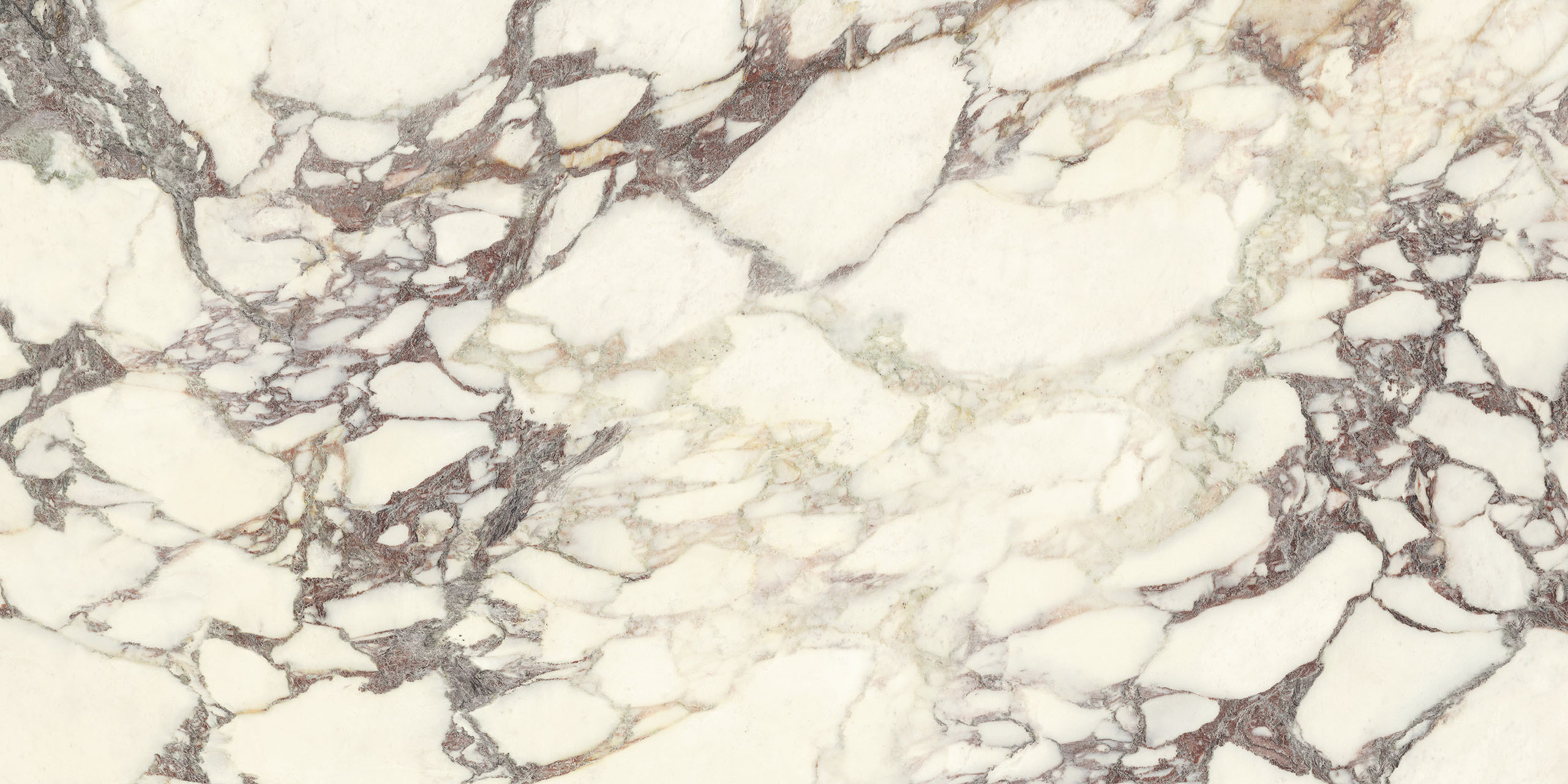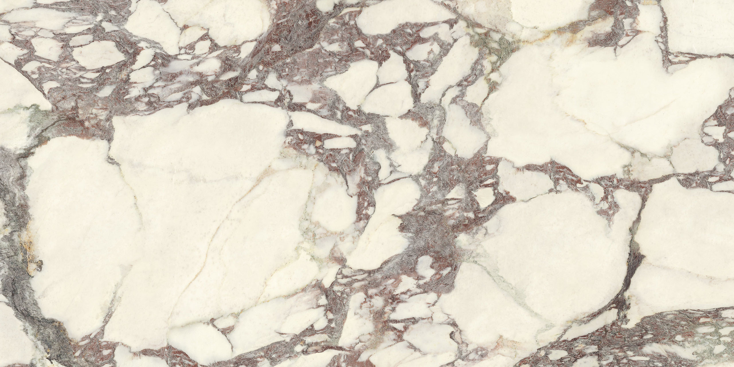 Die weitmasrige Struktur und ihr edler Charakter erinnern an antiken Glanz. Der Bindemittel in klassischen violetten Tönen zeichnet frei geformte Muster auf den warmen weißen Hintergrund, während grüne oder rosafarbene Nuancen fast goldene Akzente erhalten. Die Polychromie ist perfekt vollendet. Erhältlich in klassischen und Maximum-Formaten.