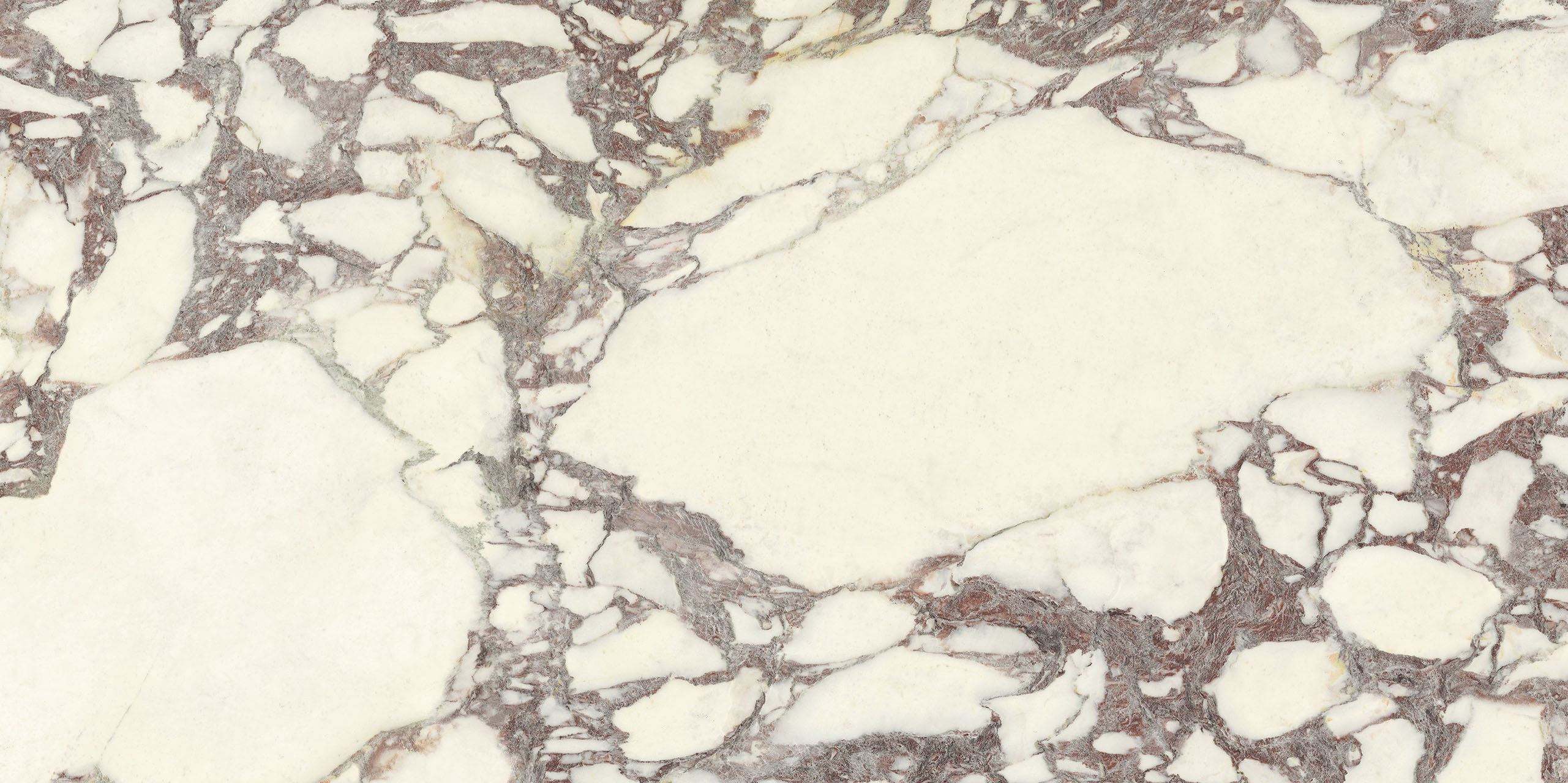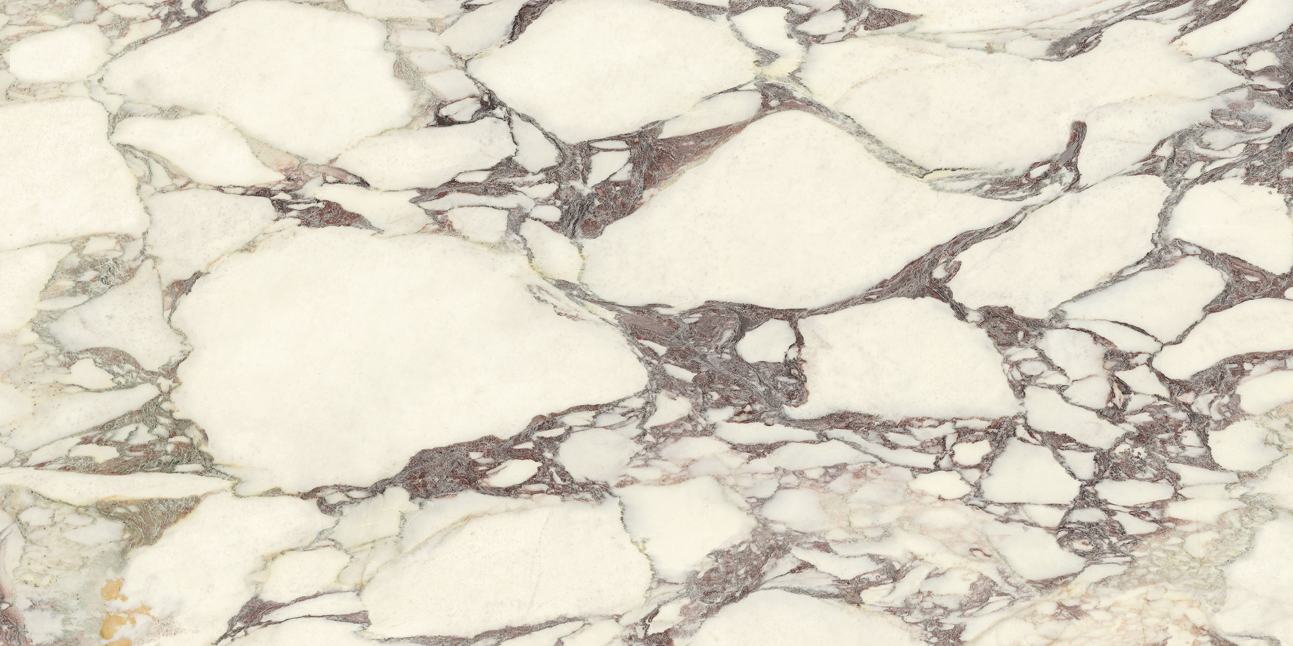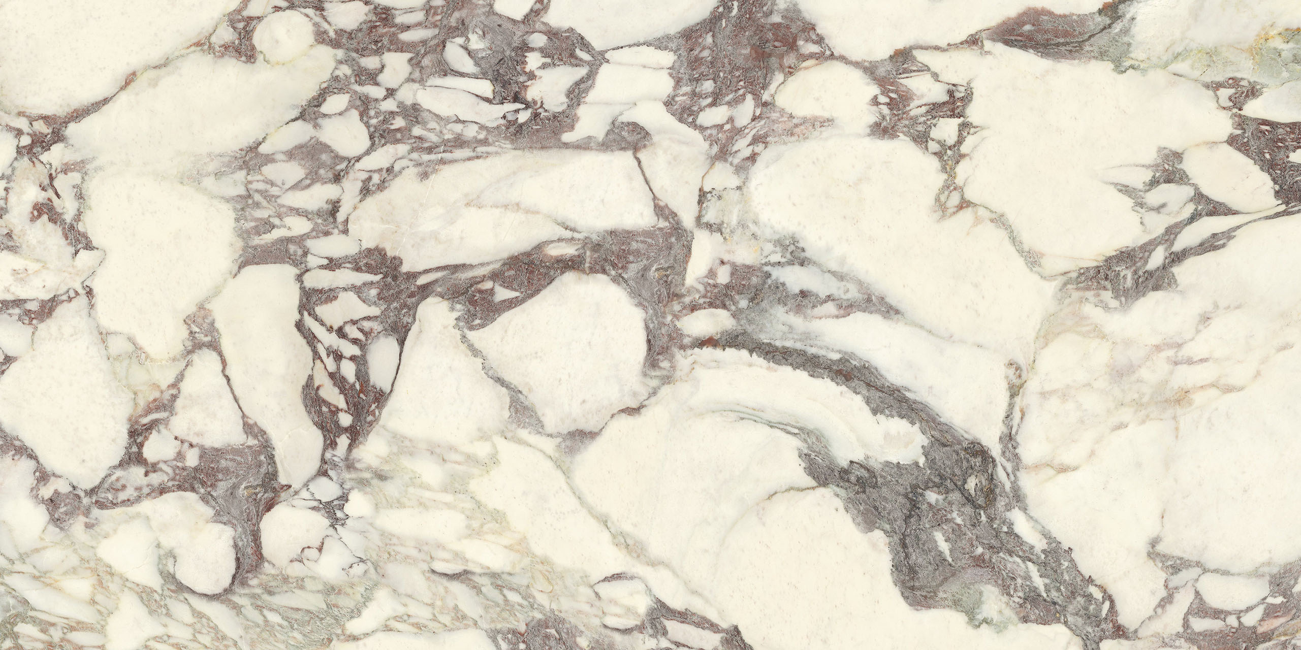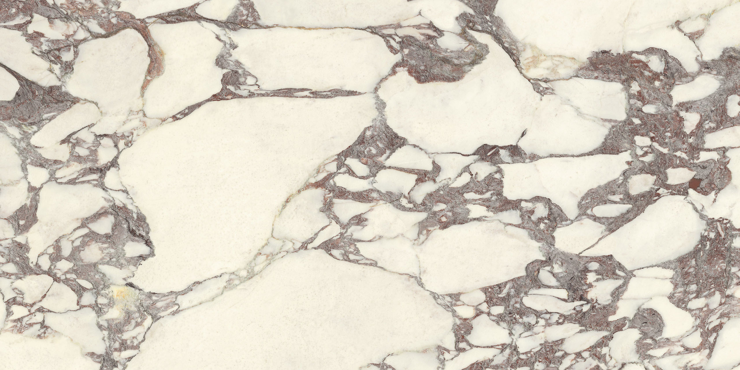 Die weitmasrige Struktur und ihr edler Charakter erinnern an antiken Glanz. Der Bindemittel in klassischen violetten Tönen zeichnet frei geformte Muster auf den warmen weißen Hintergrund, während grüne oder rosafarbene Nuancen fast goldene Akzente erhalten. Die Polychromie ist perfekt vollendet. Erhältlich in klassischen und Maximum-Formaten.