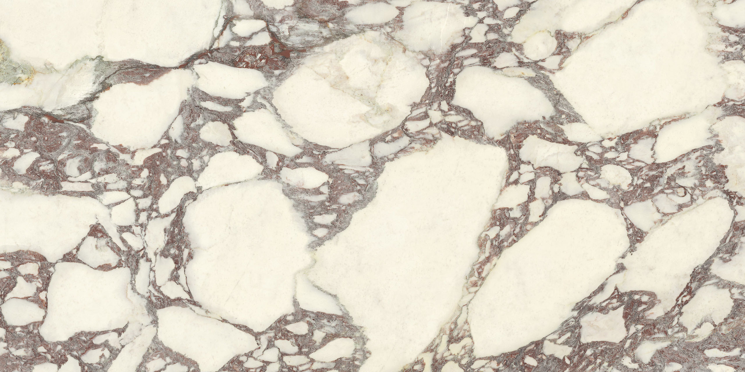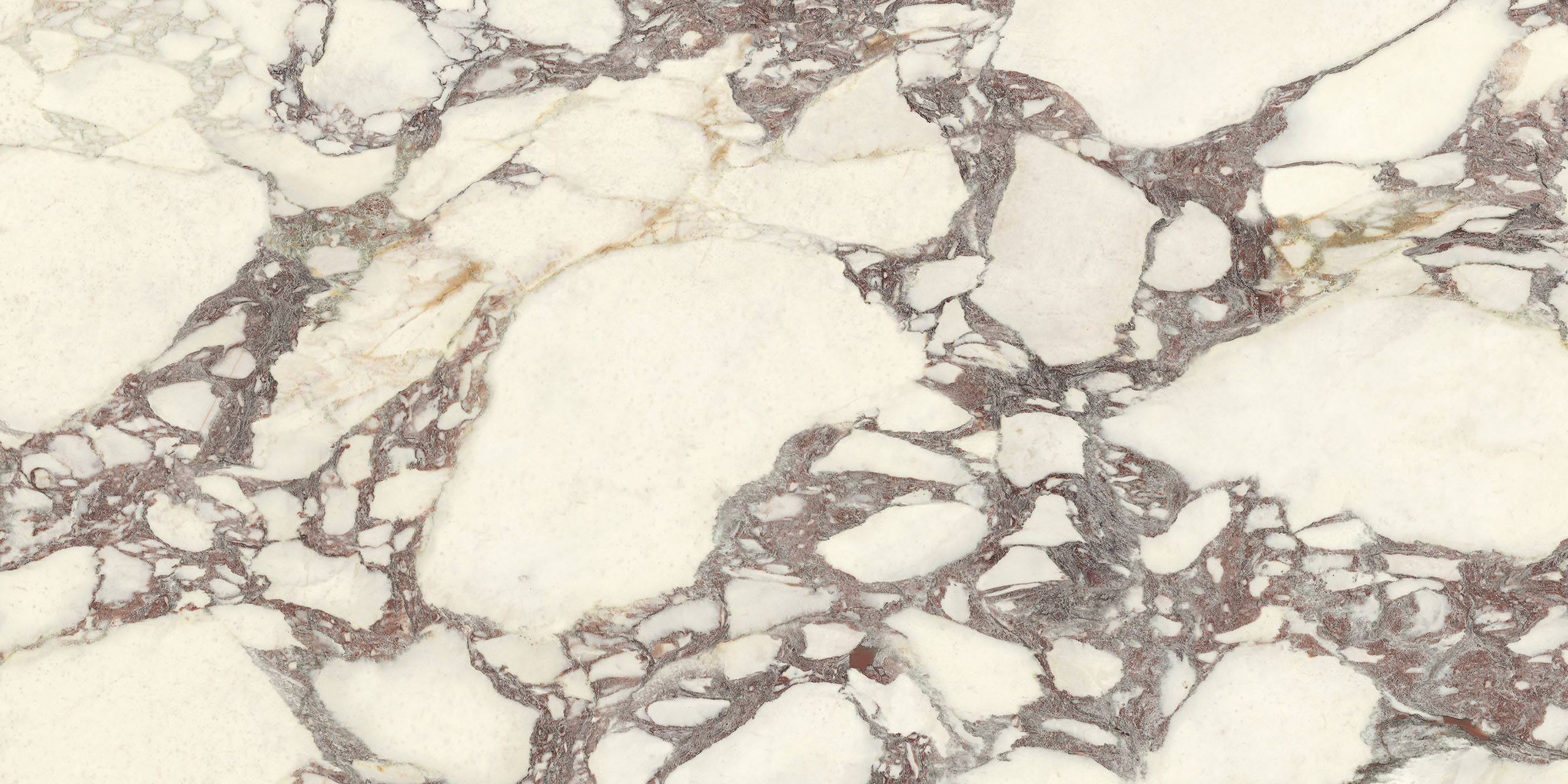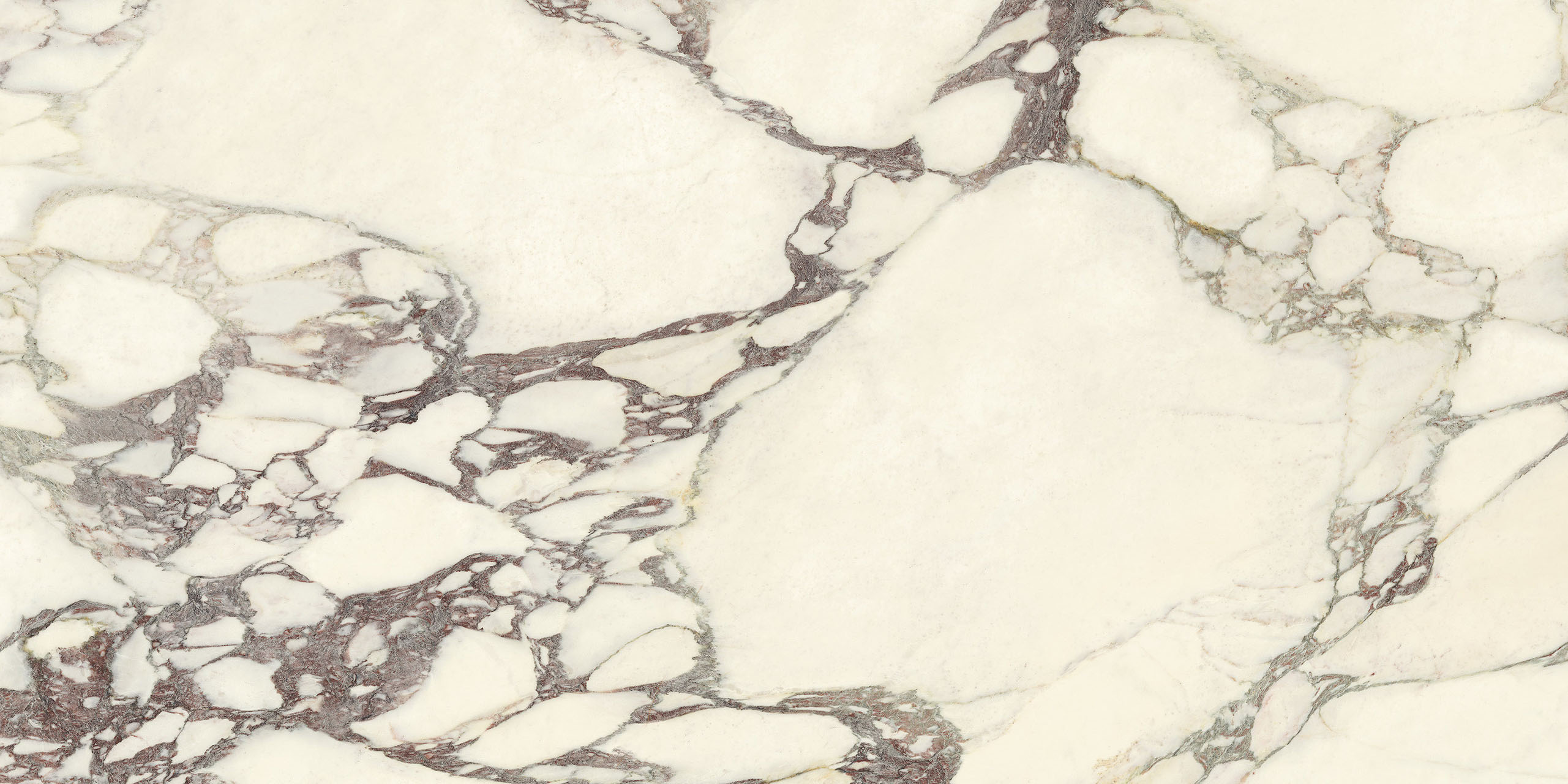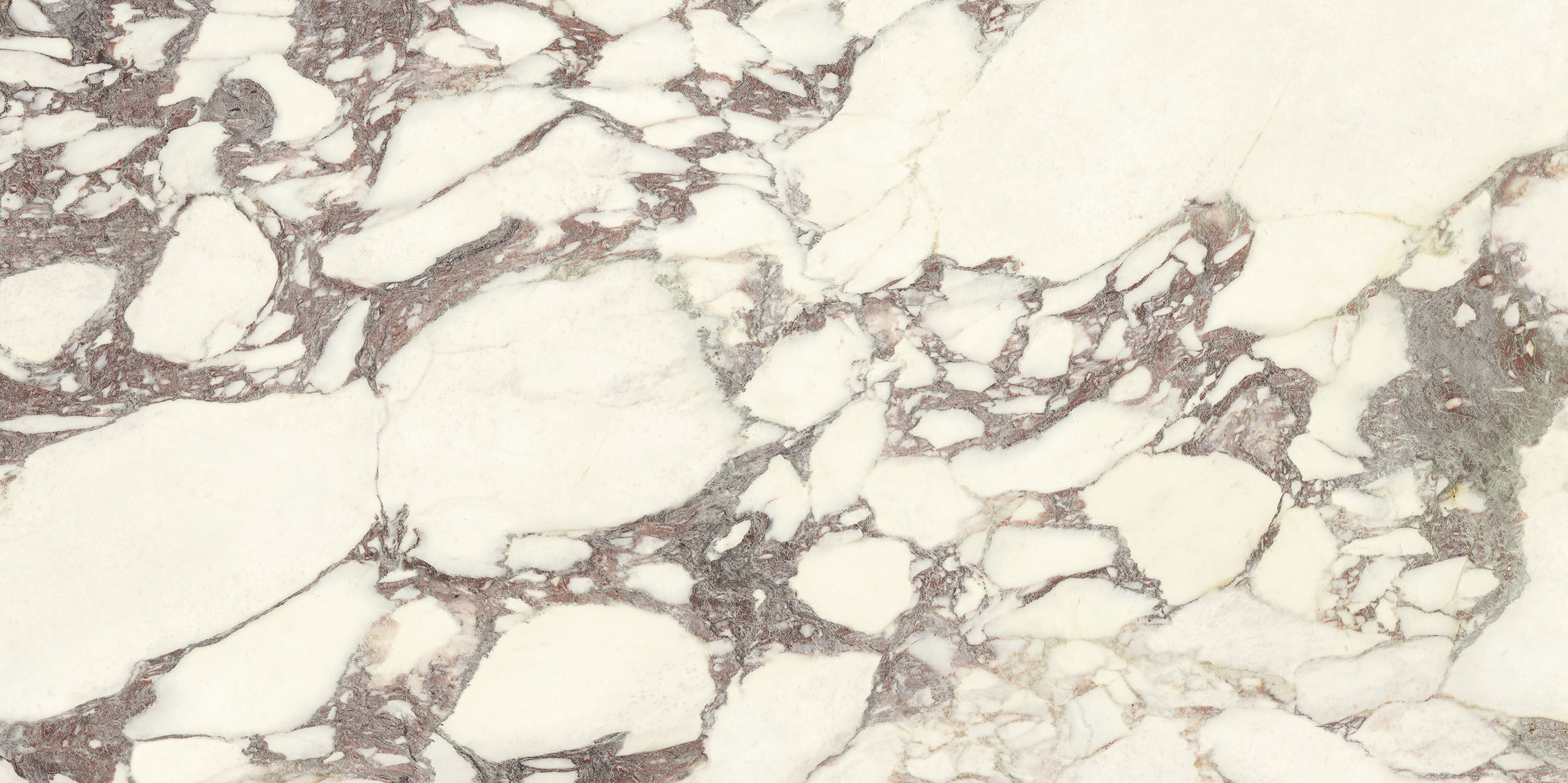 Die weitmasrige Struktur und ihr edler Charakter erinnern an antiken Glanz. Der Bindemittel in klassischen violetten Tönen zeichnet frei geformte Muster auf den warmen weißen Hintergrund, während grüne oder rosafarbene Nuancen fast goldene Akzente erhalten. Die Polychromie ist perfekt vollendet. Erhältlich in klassischen und Maximum-Formaten.