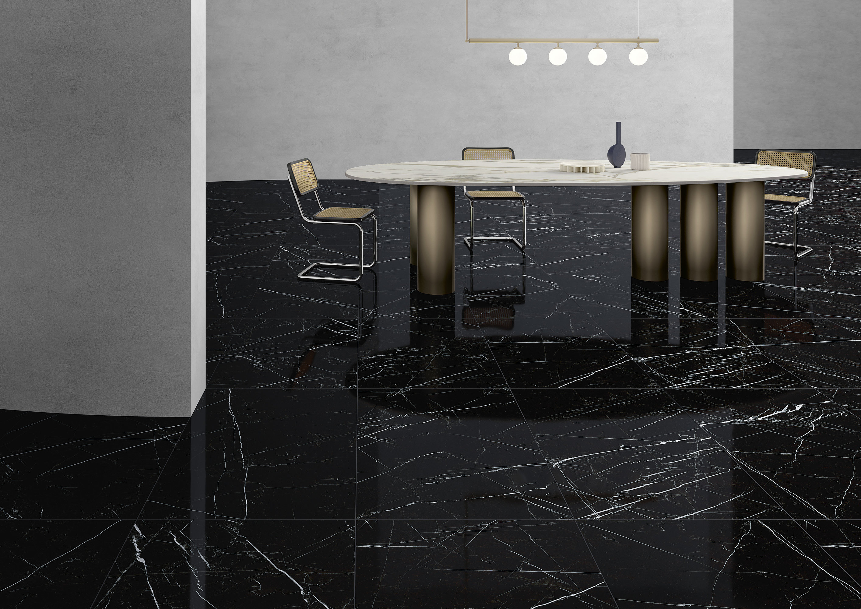 Dark Marquina zeichnet sich durch eine tiefschwarze Farbe mit feinen weißen Adern aus und bietet eine starke und faszinierende, zugleich aber hochfeine Ästhetik, erhältlich in Polished- und Silky-Oberflächen für einen spiegelnden Glanz oder einen matten, seidigen Effekt. Erhältlich in klassischen und Maximum-Formaten.