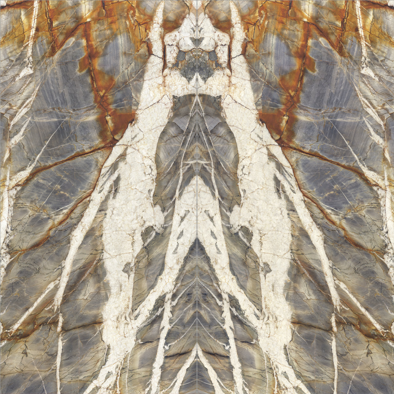 Eine Mischung aus Schattierungen von seltener Schönheit für einen keramischen Quarzit von außergewöhnlicher Wirkung, bei dem das Blau, vom tiefsten bis zum zartesten, mit breiten weißen Schlitzen sowie braunen und orangefarbenen Einsätzen gesprenkelt ist. Die aufeinander abgestimmten “book-matched” Seiten erzeugen Symmetriespiele, die durch die glänzende Oberfläche noch eindrucksvoller werden. Eine kühne und spektakuläre Oberfläche, die jedes Projekt und jede Einrichtung schier unvergesslich macht.
