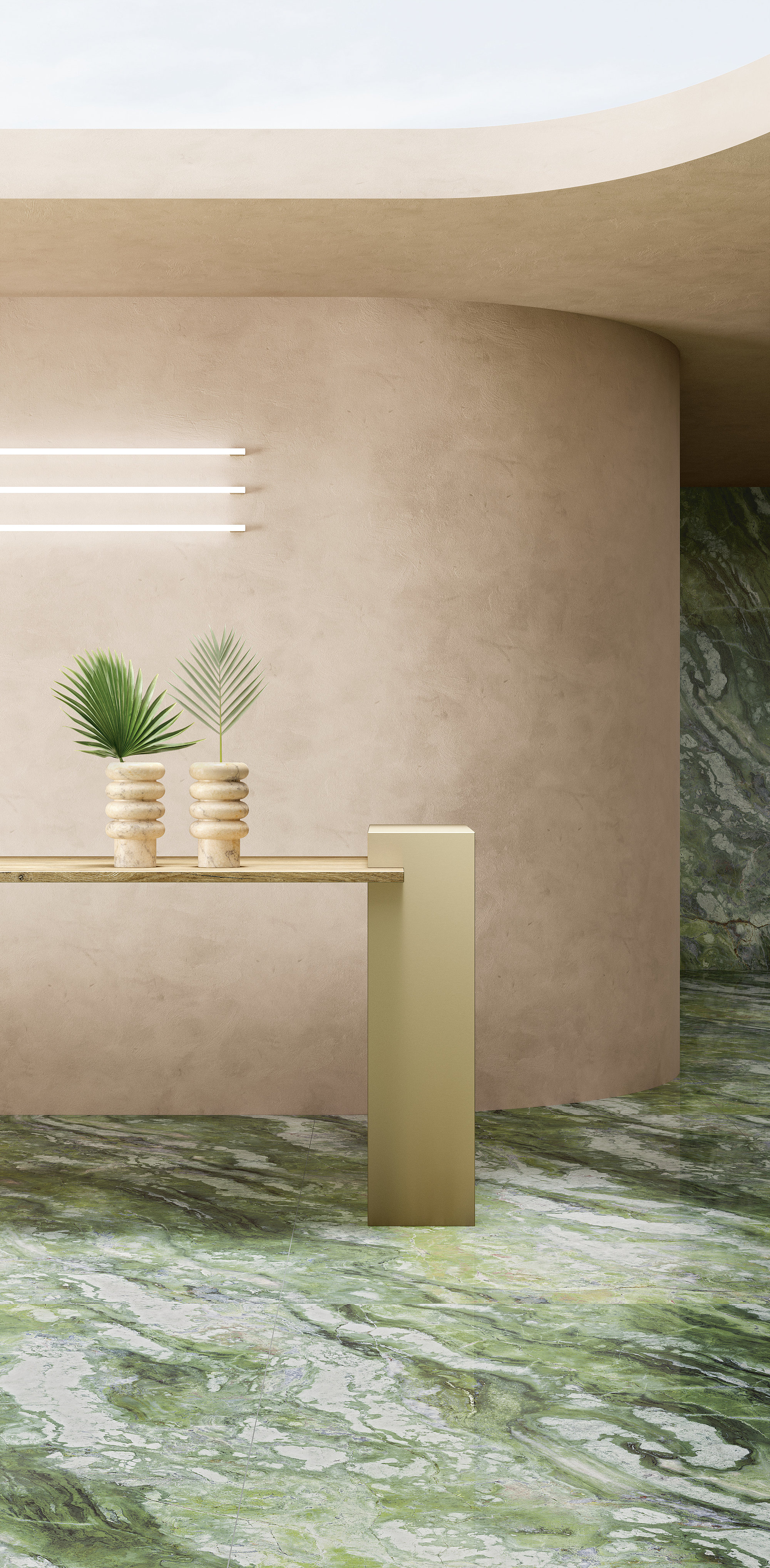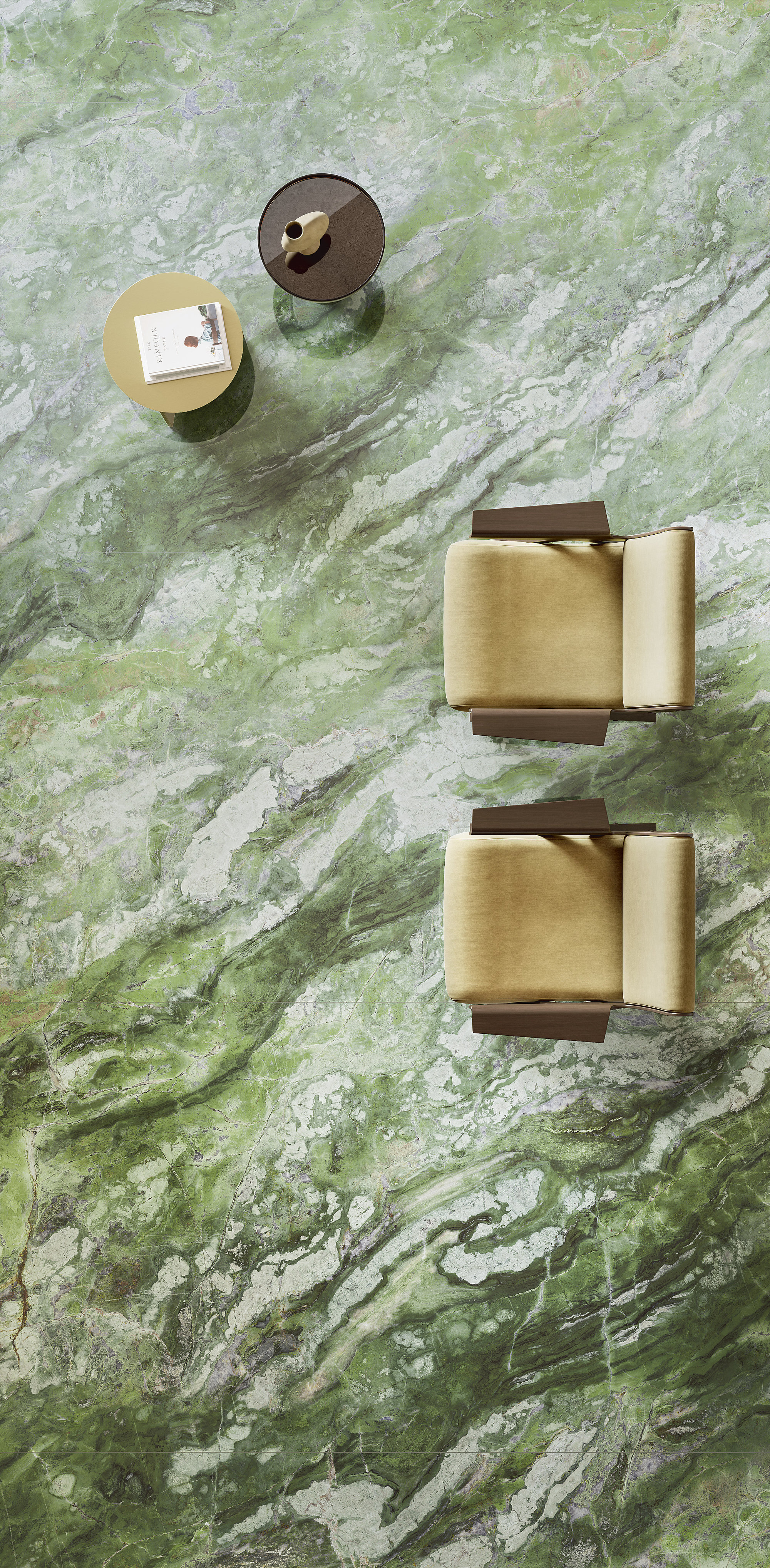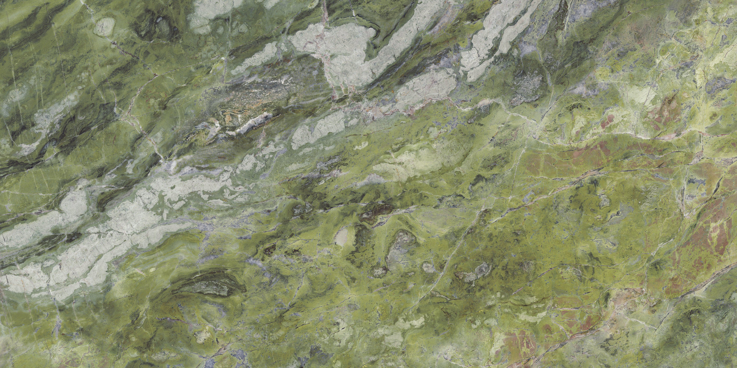 Auf einem leuchtend grünen, leicht sauren Hintergrund treten Cremetöne, Sepia, Braun und Grau auf, unterbrochen von Adern, die an kristalline Calcit erinnern. Der Untergrund ist nicht einheitlich und zeigt verschiedene Grüntöne von hell bis dunkel, hervorgehoben durch die Polished-Oberfläche. Irish Green Maximum orientiert sich an einem eher seltenen und alten Marmor mit unzähligen Grüntönen. Das besondere Muster und die 6 mm Dicke machen es ideal für vielfältige Anwendungen im Innen- und Außenbereich, wie Bodenbeläge oder Wandverkleidungen, sowie für Möbel.