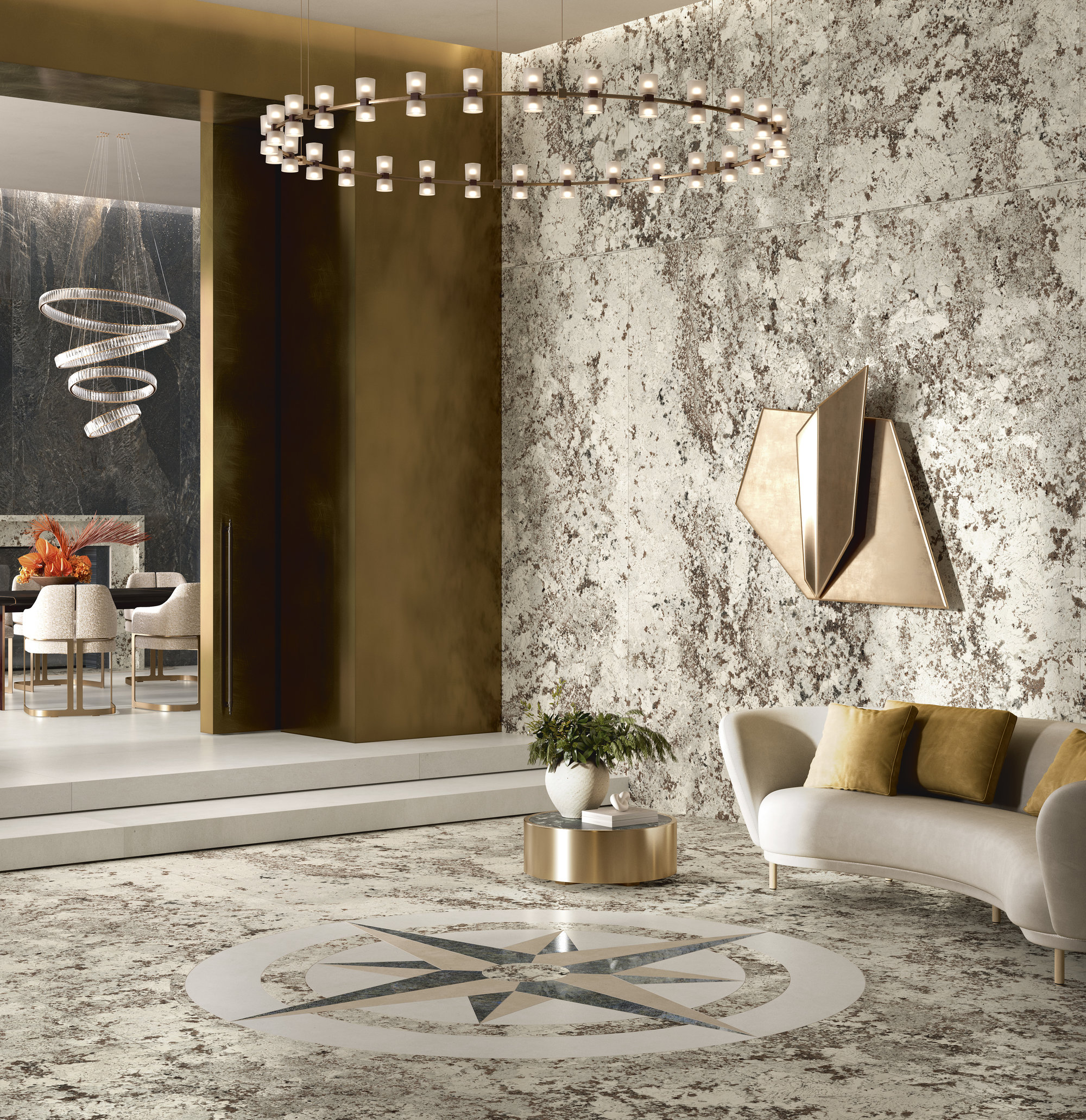 Wie ein Werk von Jackson Pollock besteht es aus reinstem Dripping weißer, brauner, roter und grauer Farbe auf einer makellosen „keramischen Leinwand“. Seine Einzigartigkeit liegt in der Farbexplosion, die durch zwei noch nie dagewesene Oberflächenbehandlungen – teilpoliert und semi-matt – noch belebt wird.