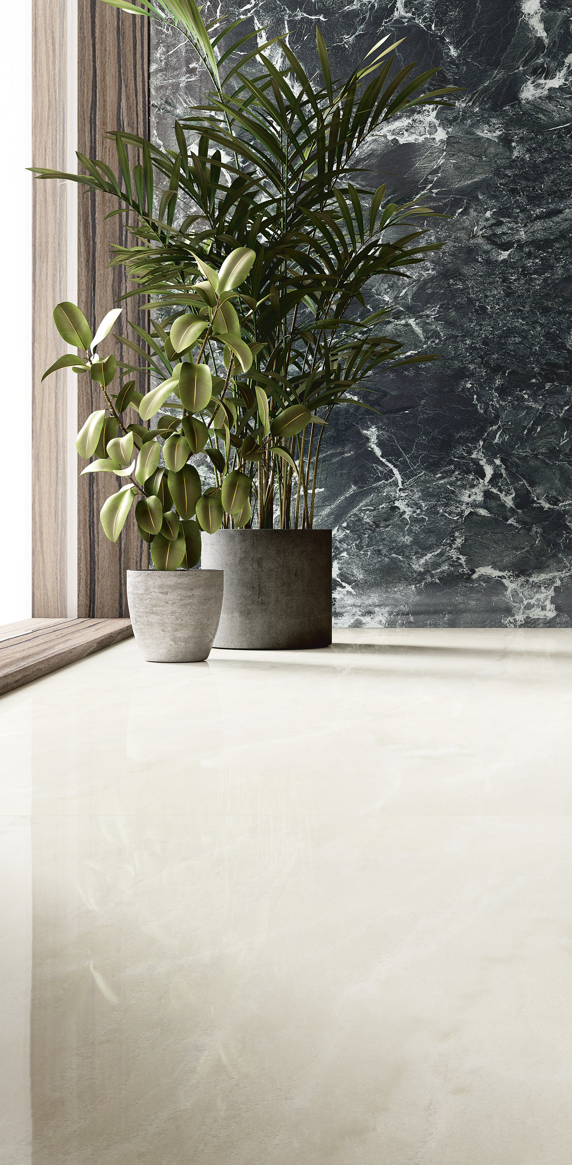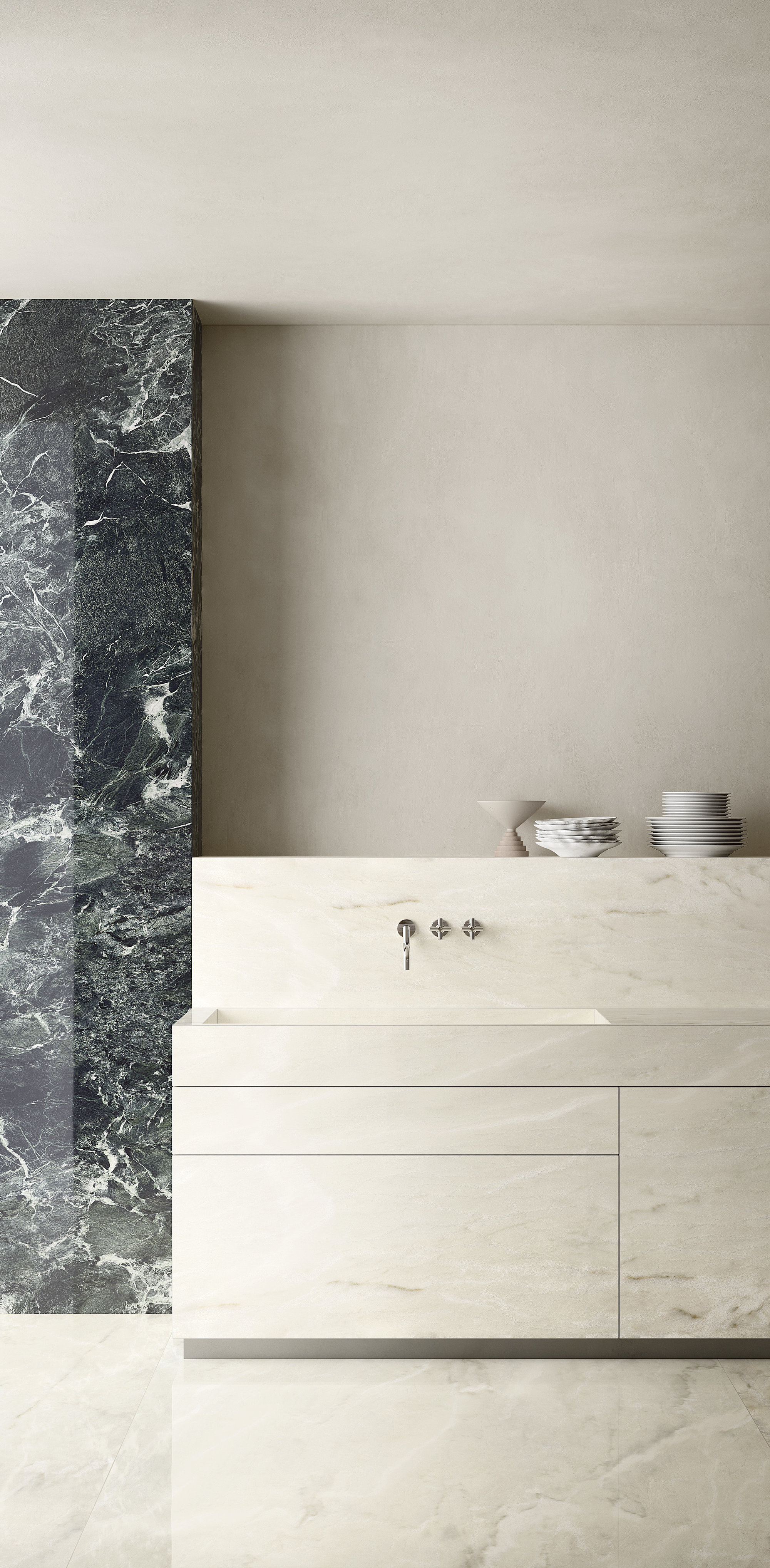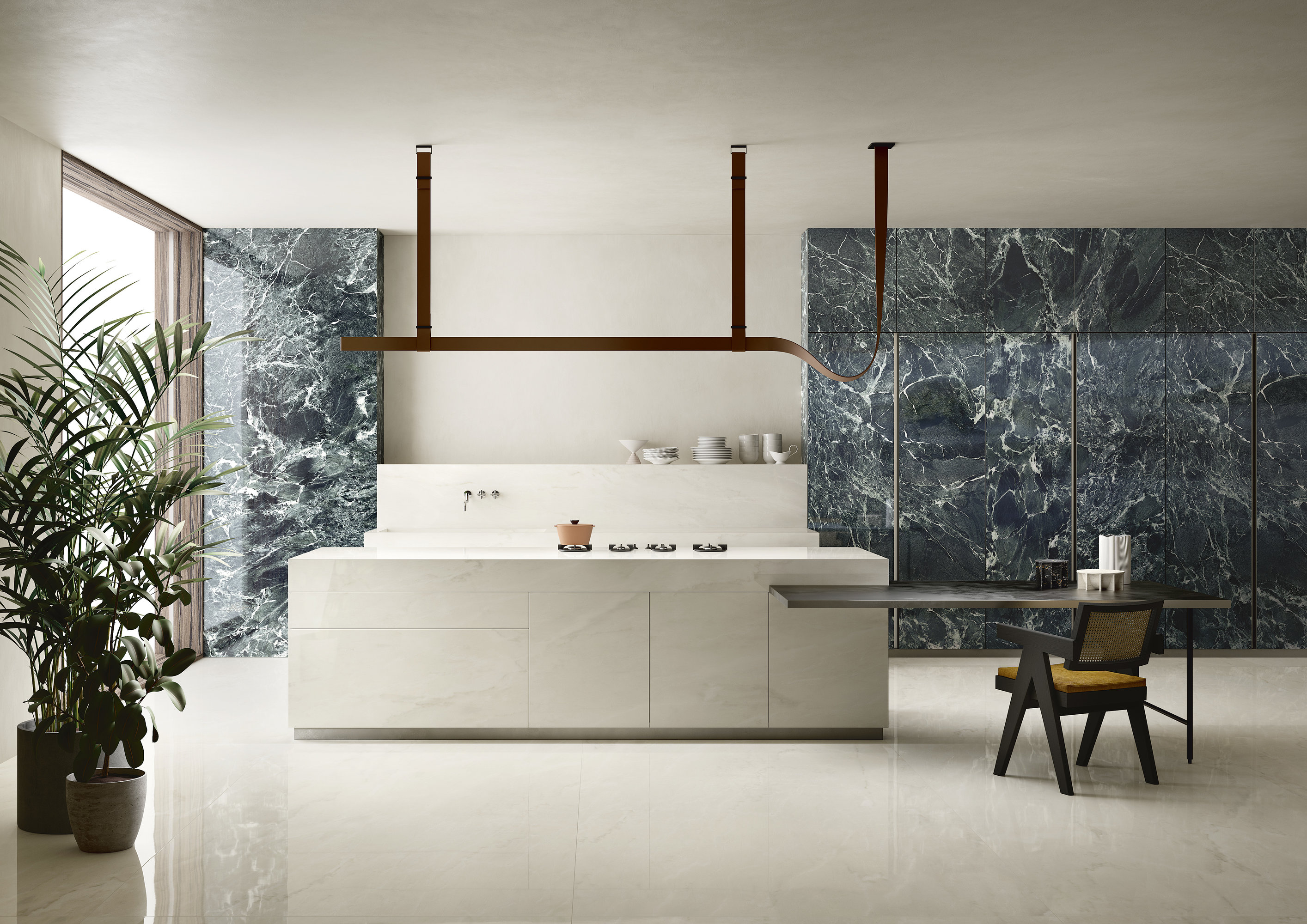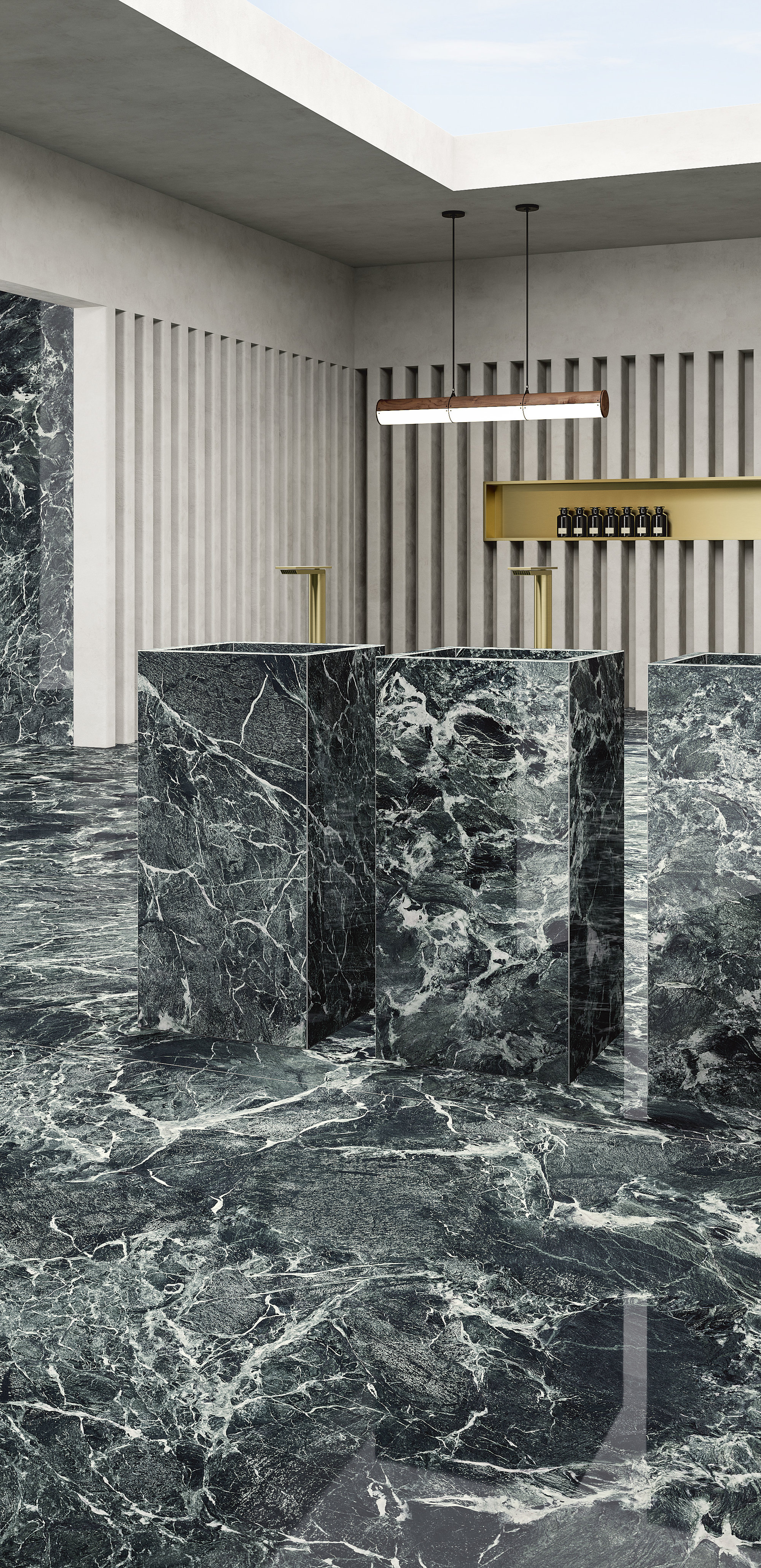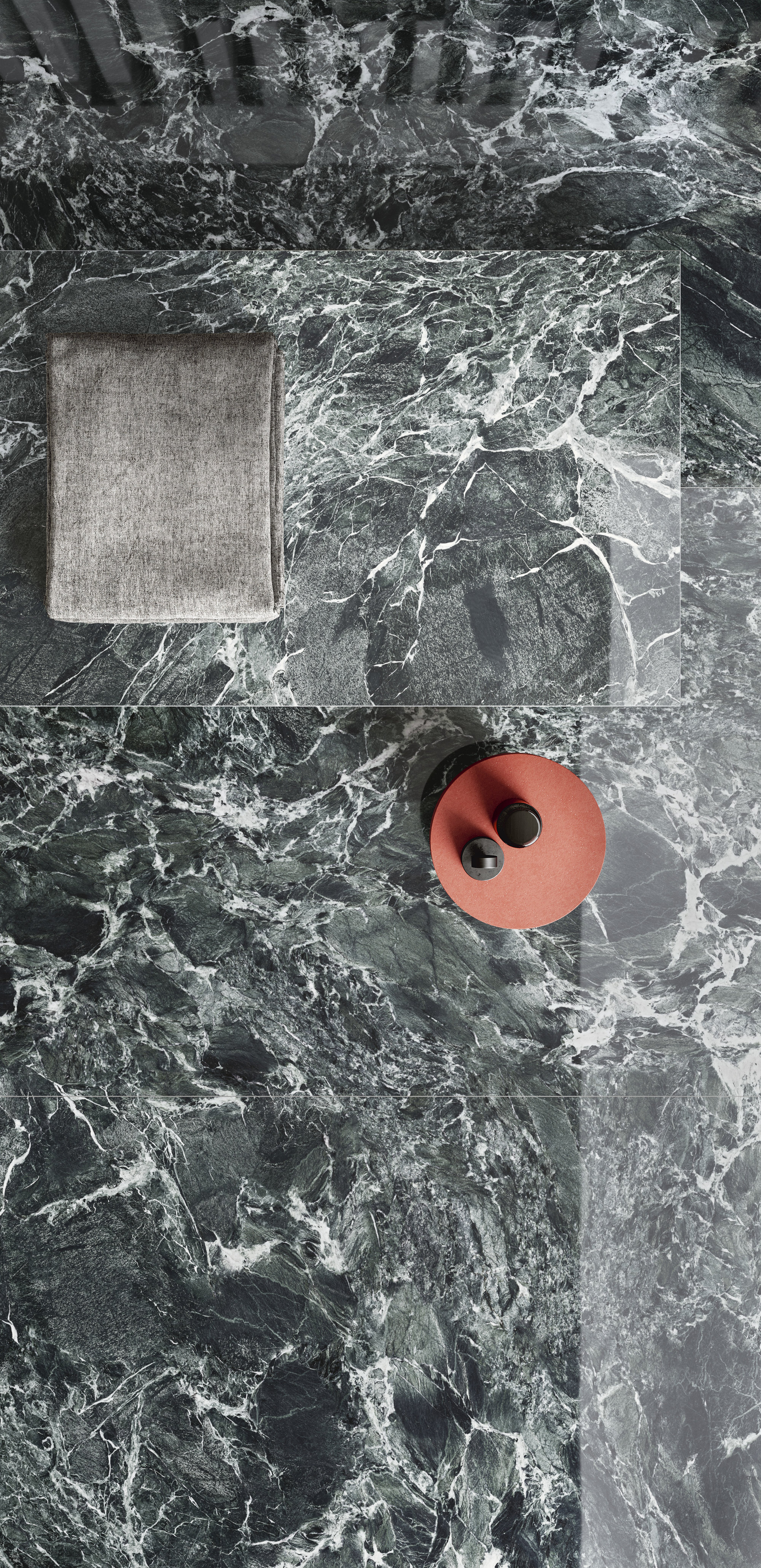 Alpi Chiaro Venato Maximum vereint einen intensiven grünen Untergrund mit weißen Adern, die Eleganz und Tiefe betonen. Erhältlich in verschiedenen Formaten, eignet es sich für Böden, Wandverkleidungen und Möbel, während die Größen 270x120 und 120x120 cm darauf ausgelegt sind, Abfall zu minimieren und den gängigsten Standards für Wände und Duschwannen zu entsprechen.