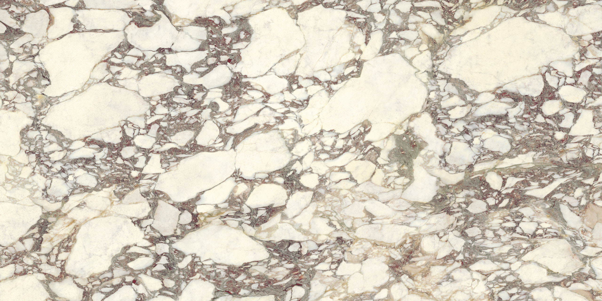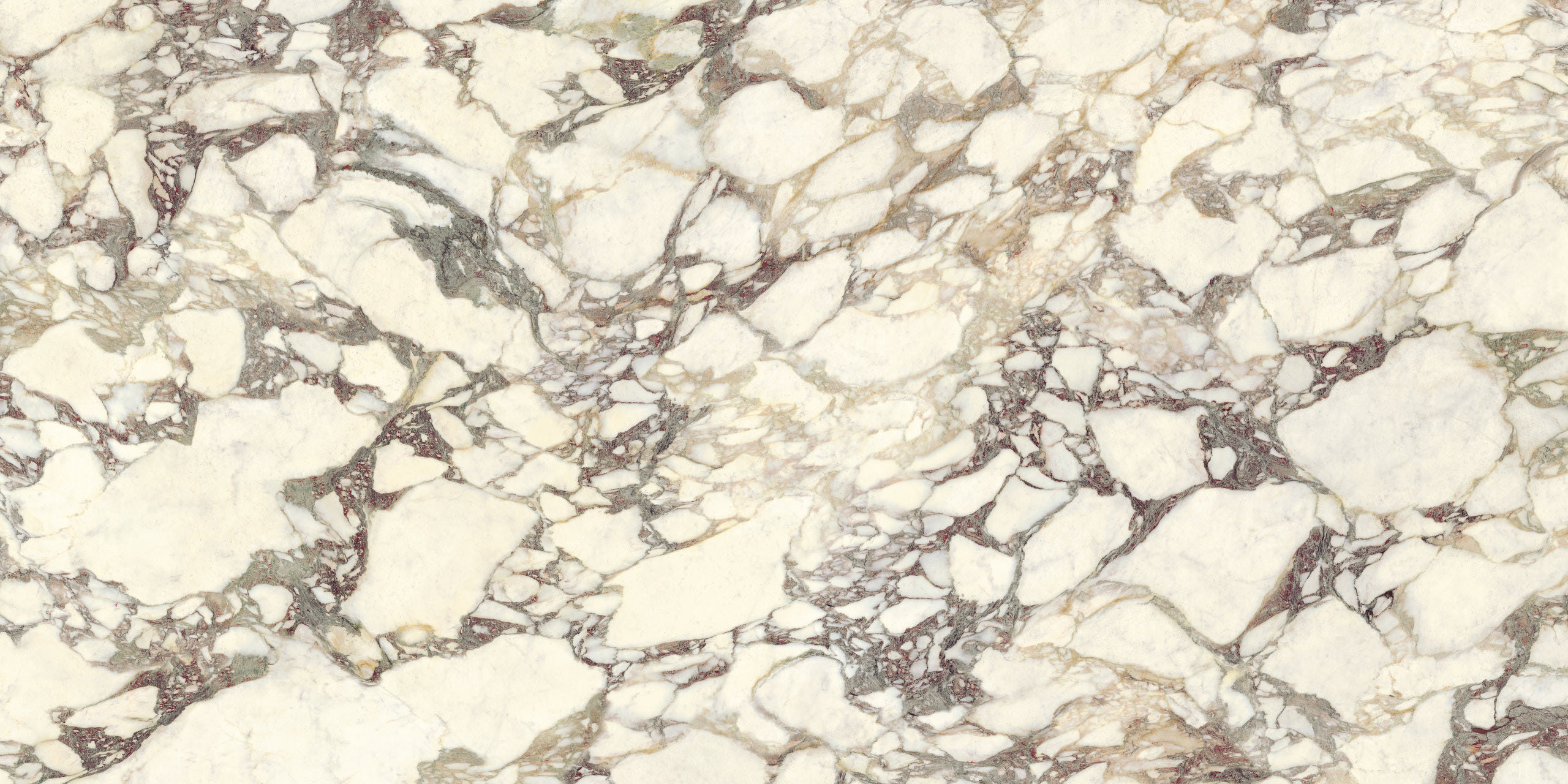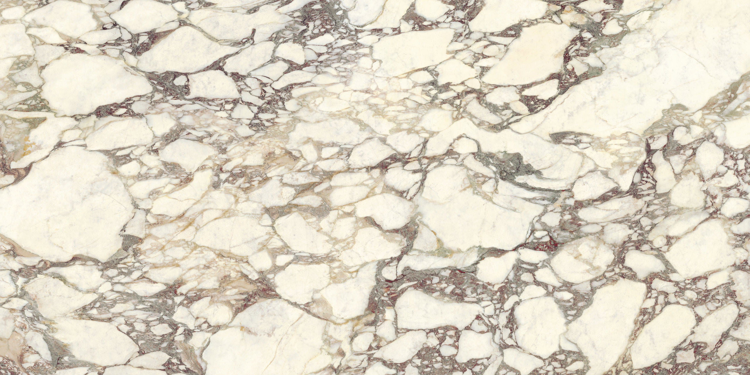 Die weitmasrige Struktur und ihr edler Charakter erinnern an antiken Glanz. Der Bindemittel in klassischen violetten Tönen zeichnet frei geformte Muster auf den warmen weißen Hintergrund, während grüne oder rosafarbene Nuancen fast goldene Akzente erhalten. Die Polychromie ist perfekt vollendet. Erhältlich in klassischen und Maximum-Formaten.