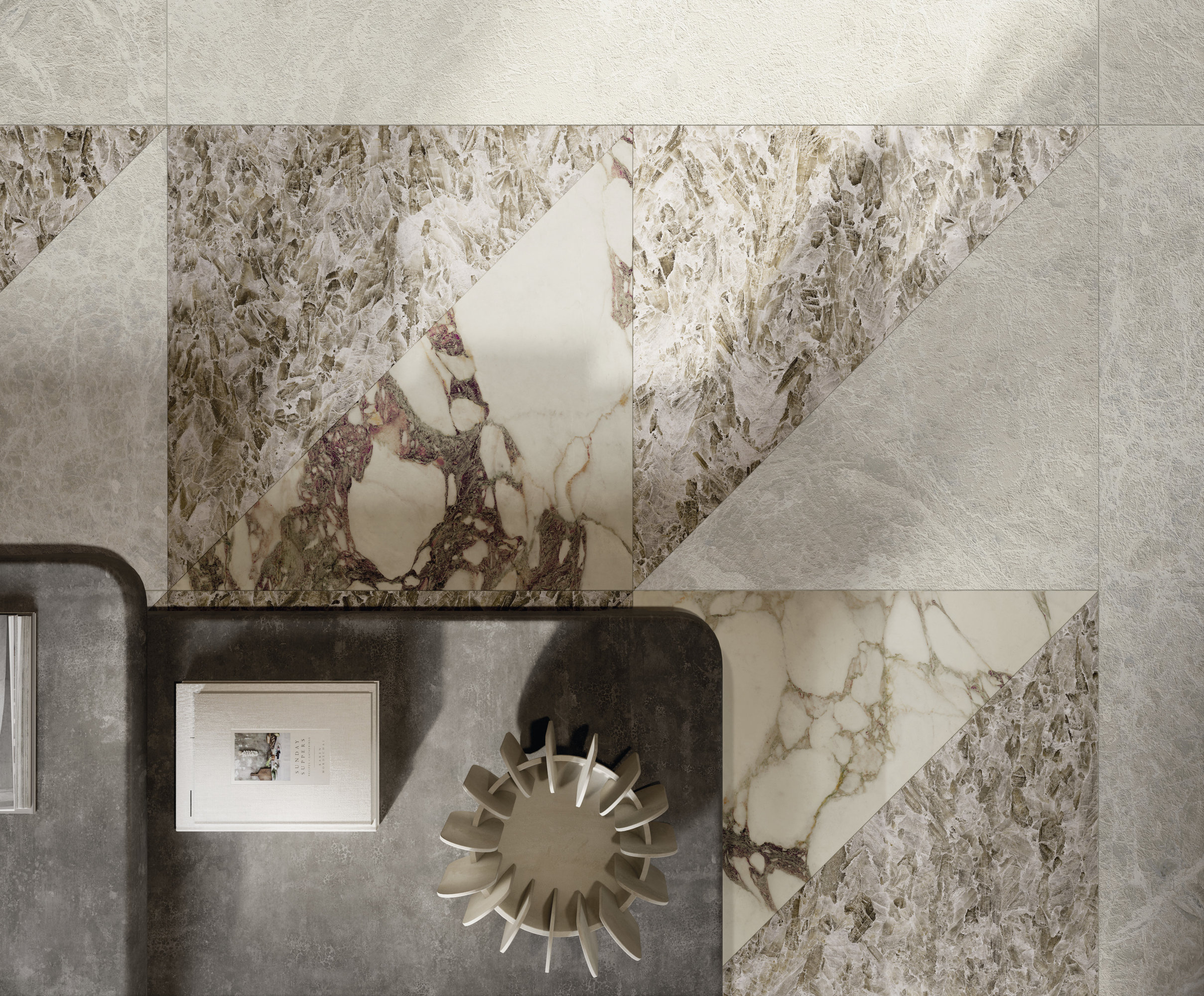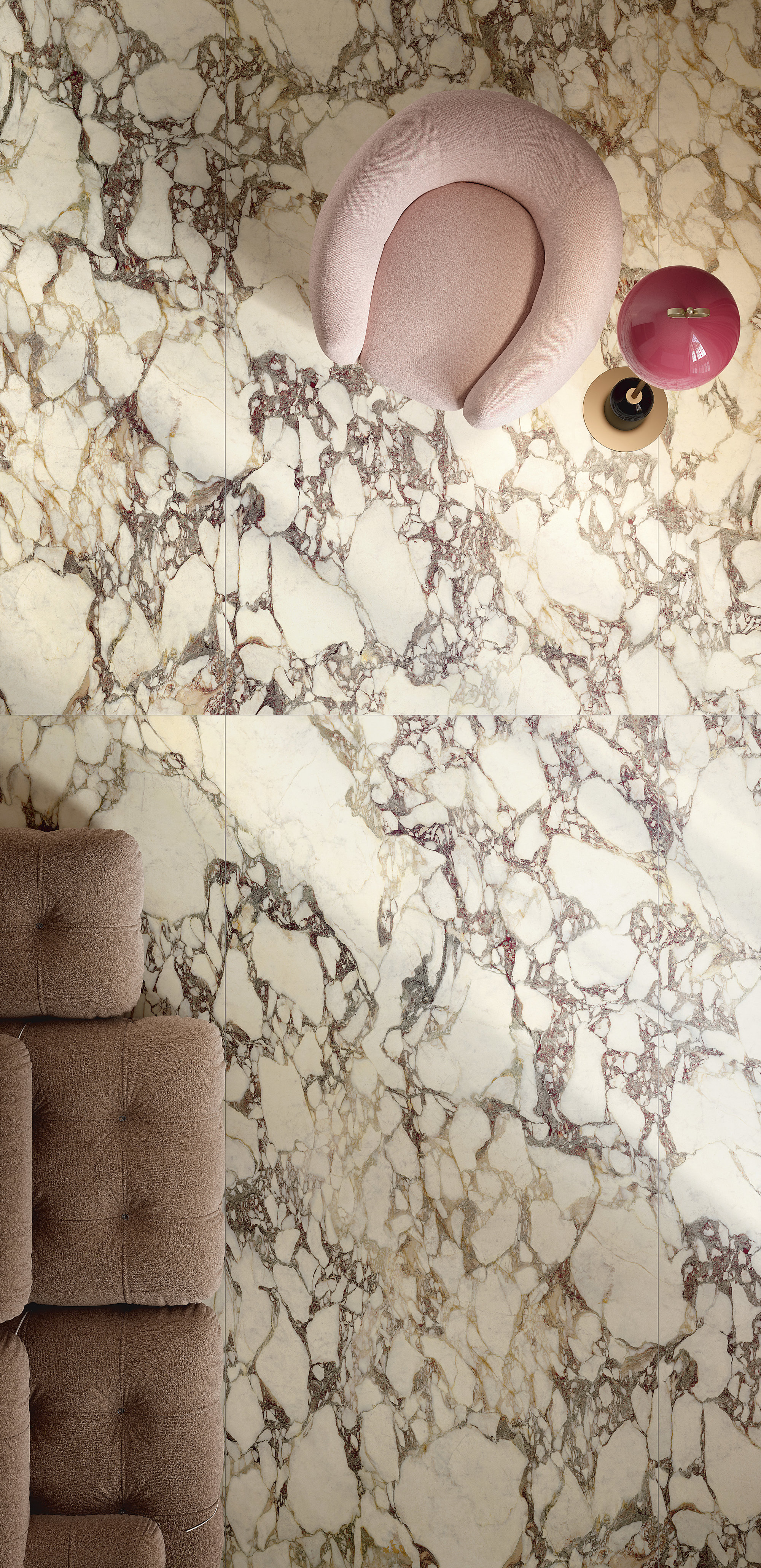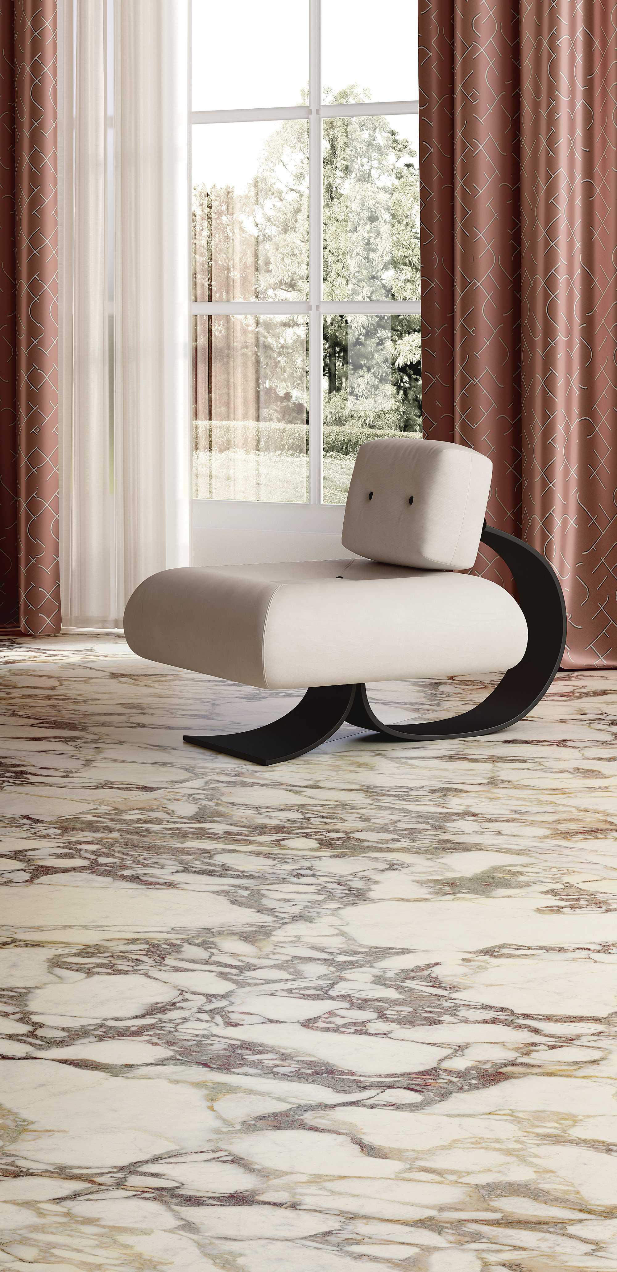 Die weitmasrige Struktur und ihr edler Charakter erinnern an antiken Glanz. Der Bindemittel in klassischen violetten Tönen zeichnet frei geformte Muster auf den warmen weißen Hintergrund, während grüne oder rosafarbene Nuancen fast goldene Akzente erhalten. Die Polychromie ist perfekt vollendet. Erhältlich in klassischen und Maximum-Formaten.