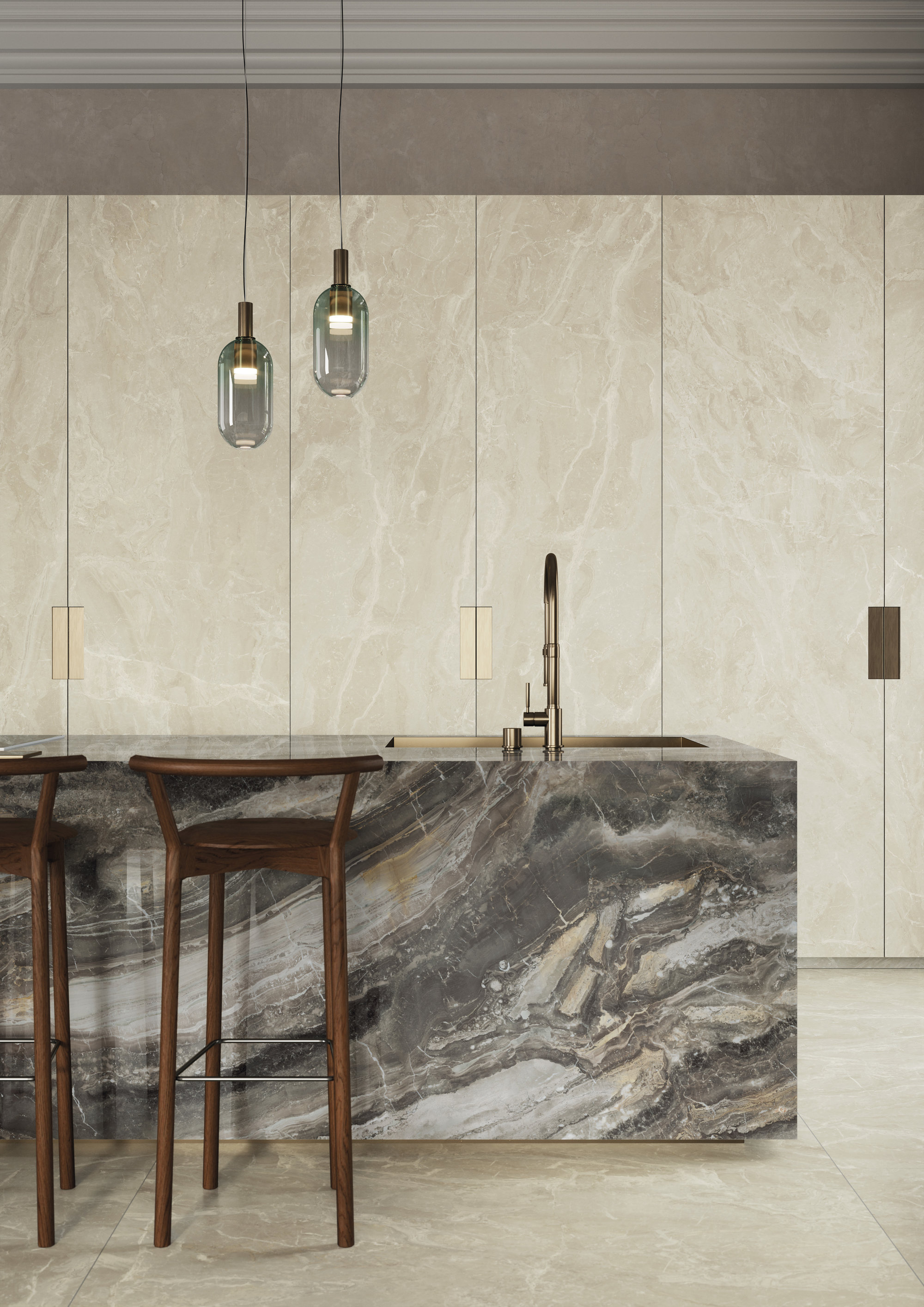 Eine edle Spur, ein Hinweis auf antiken Glanz. Eine strukturierte beige Oberfläche, durchzogen von geschwungenen weißen Einsprengseln, die den Raum aufwerten. Breccia Sarda ist eine sehr begehrte Oberfläche, hervorgehoben durch die natürliche und leicht dreidimensionale Oberfläche, ideal für Böden und Wandverkleidungen sowie für Außenfassaden. Erhältlich in klassischen und Maximum-Formaten.