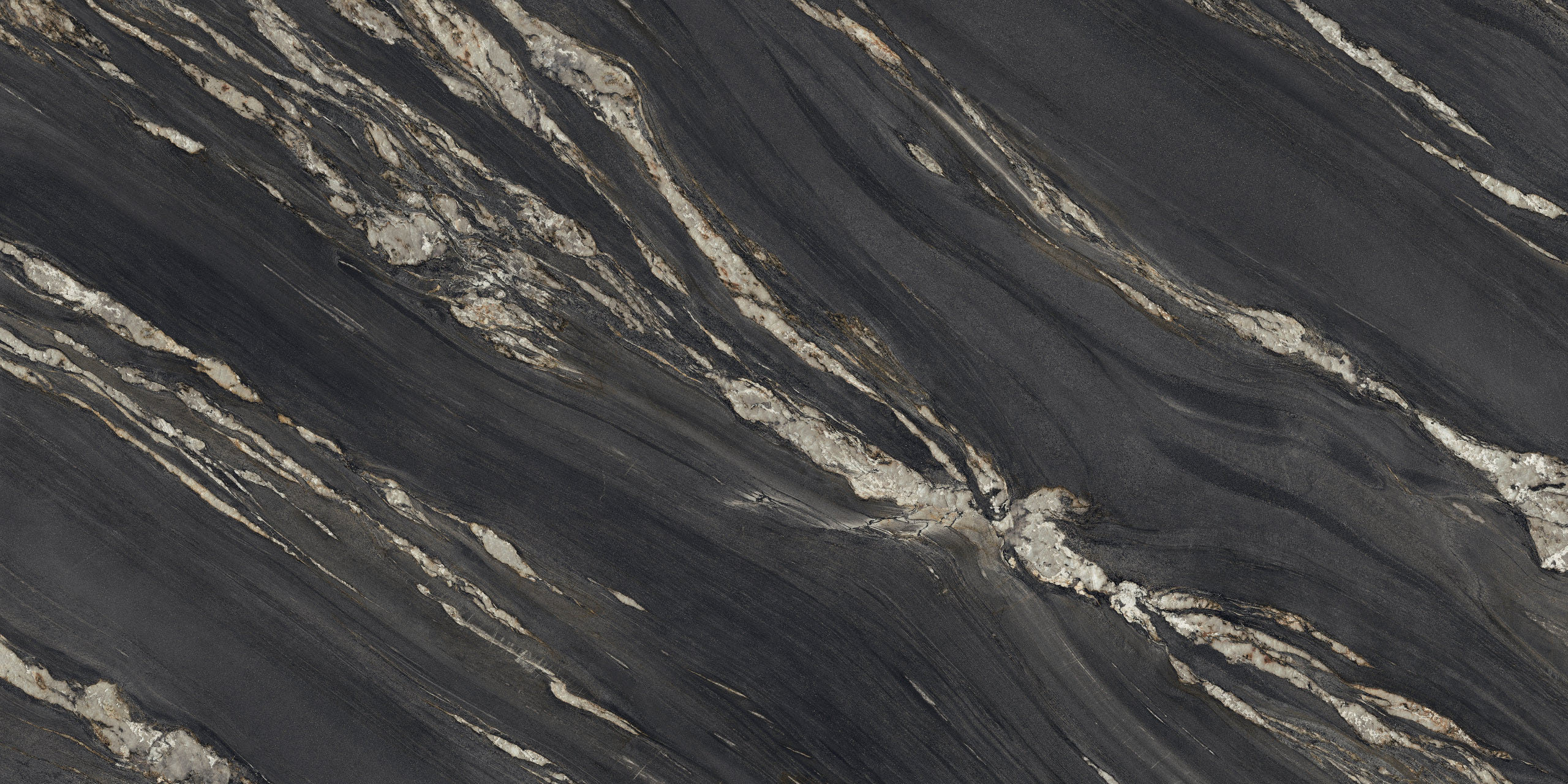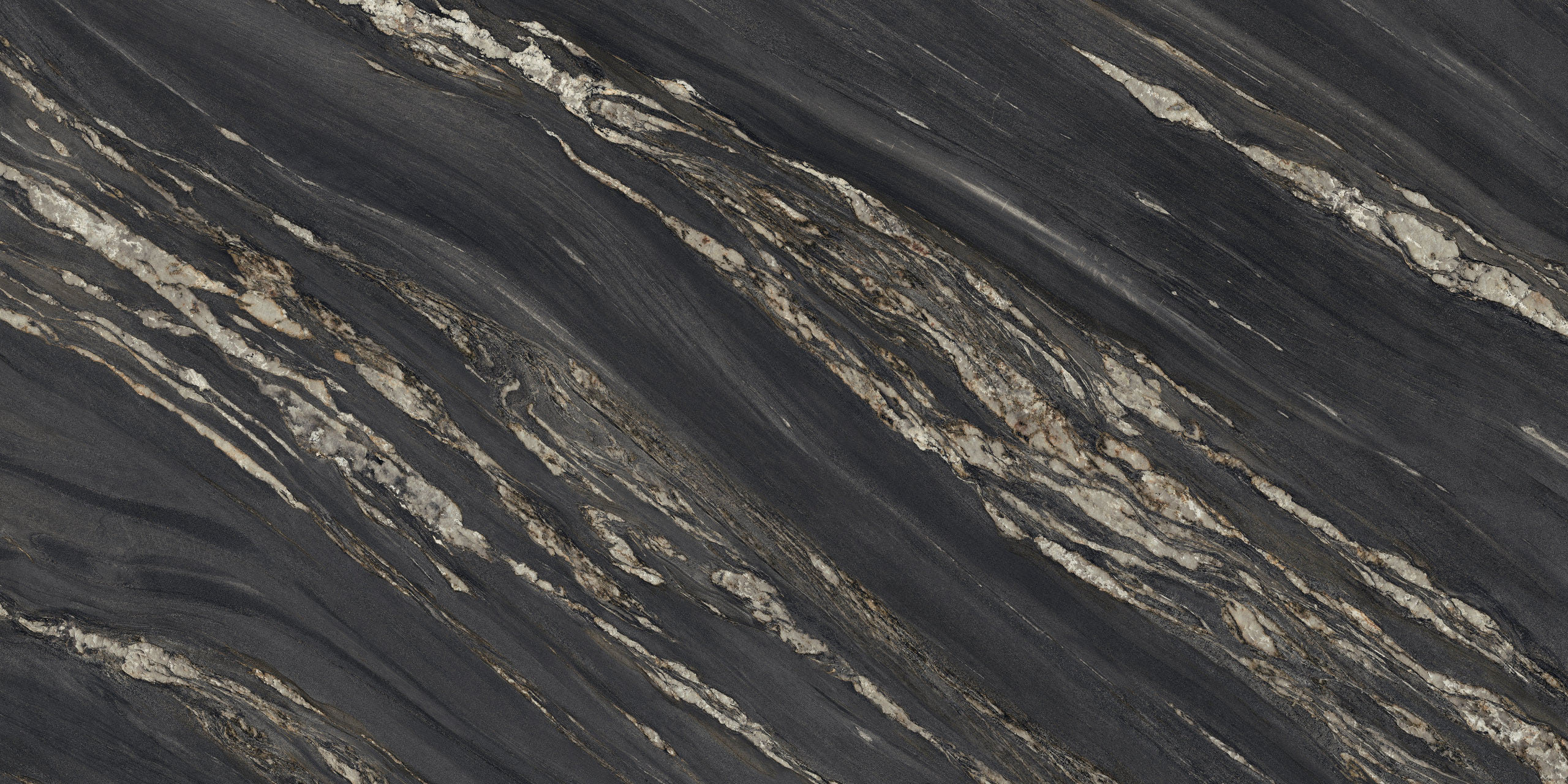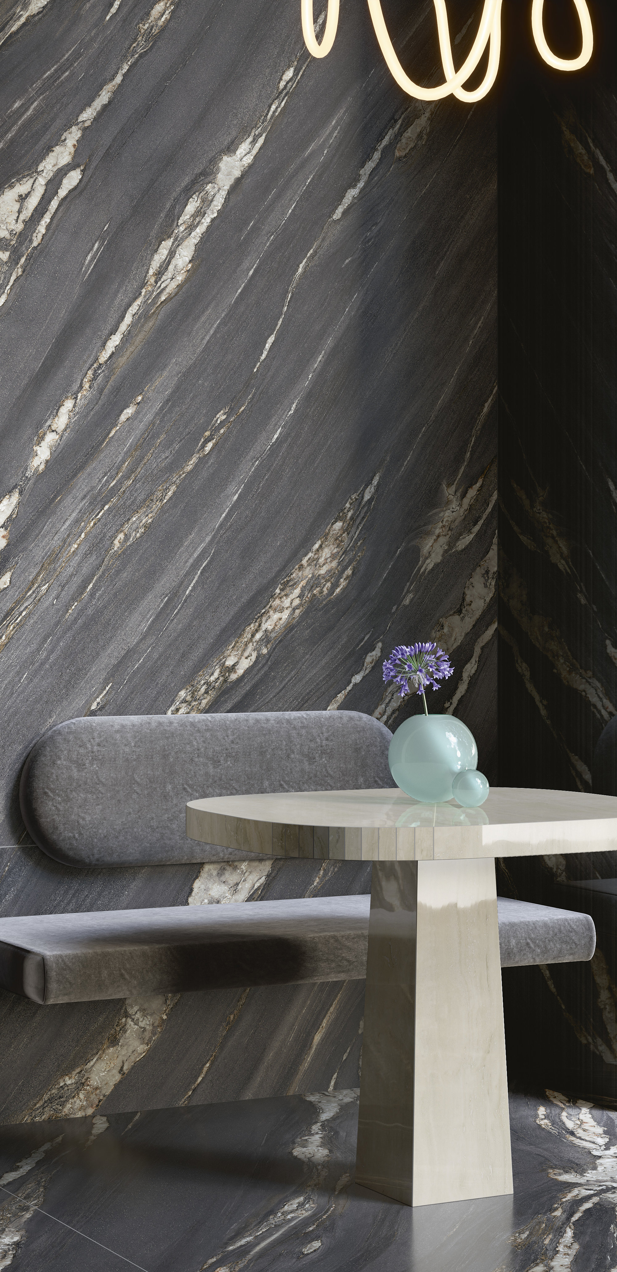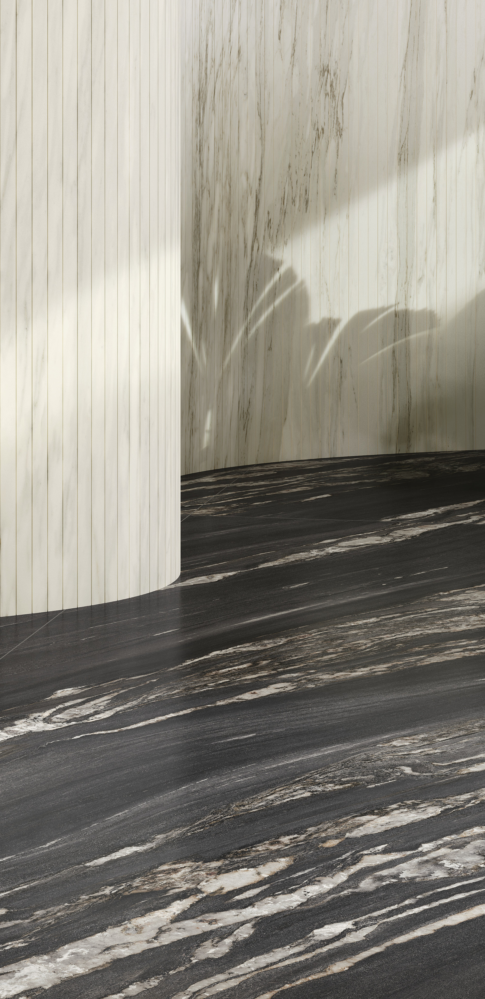 Ähnlich einer Theaterkulisse setzt der Marmor Werke in Szene, die von einer kräftigen dekorativen Glut erleuchtet werden. Auf der Oberfläche erblühen abwechselnd flammenähnliche, bräunlich-goldene Mineral-Arabesken, deren wellenförmige Bewegung dem dramatisch-geheimnisvollen Mineralienmantel Wärme und Bedeutung verleiht.