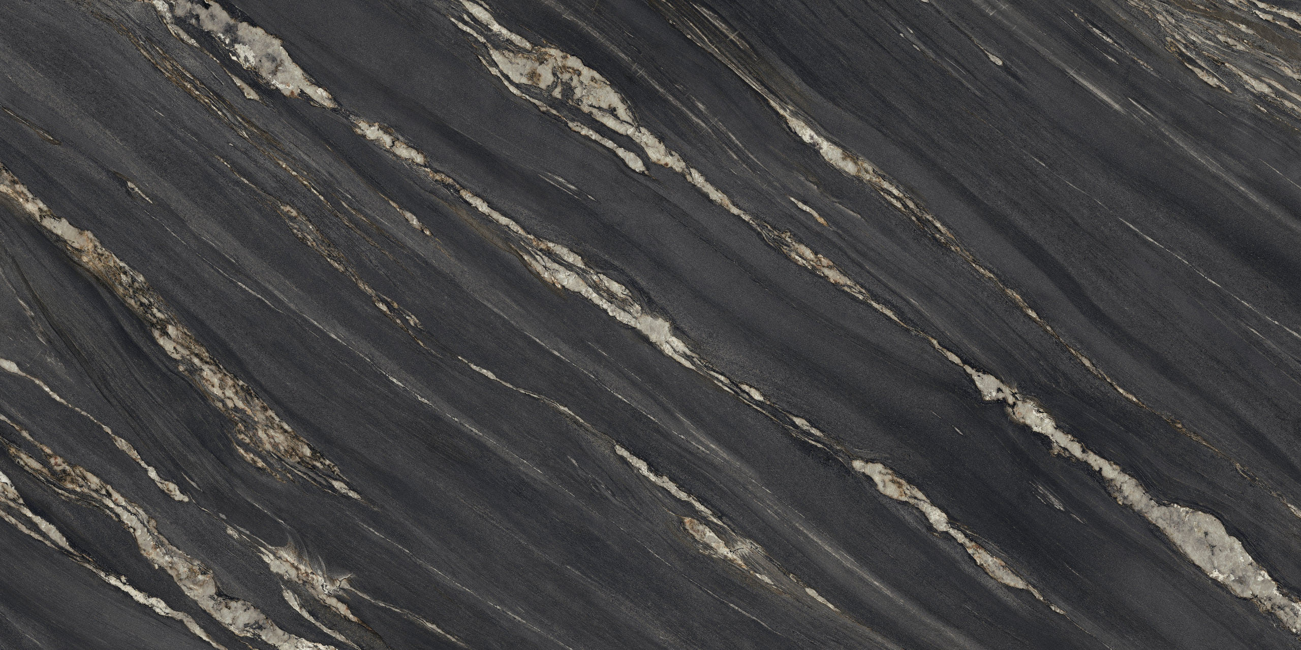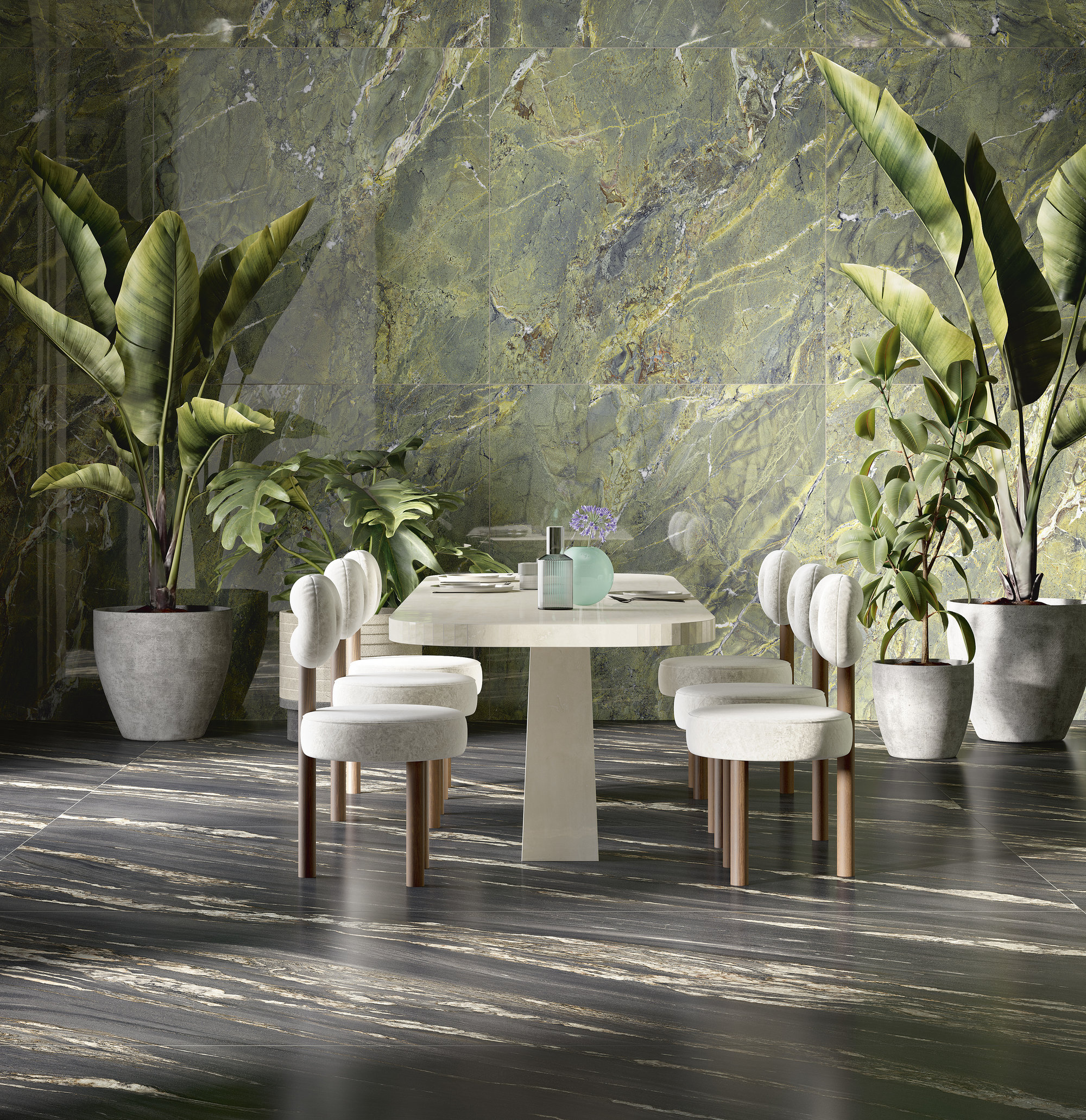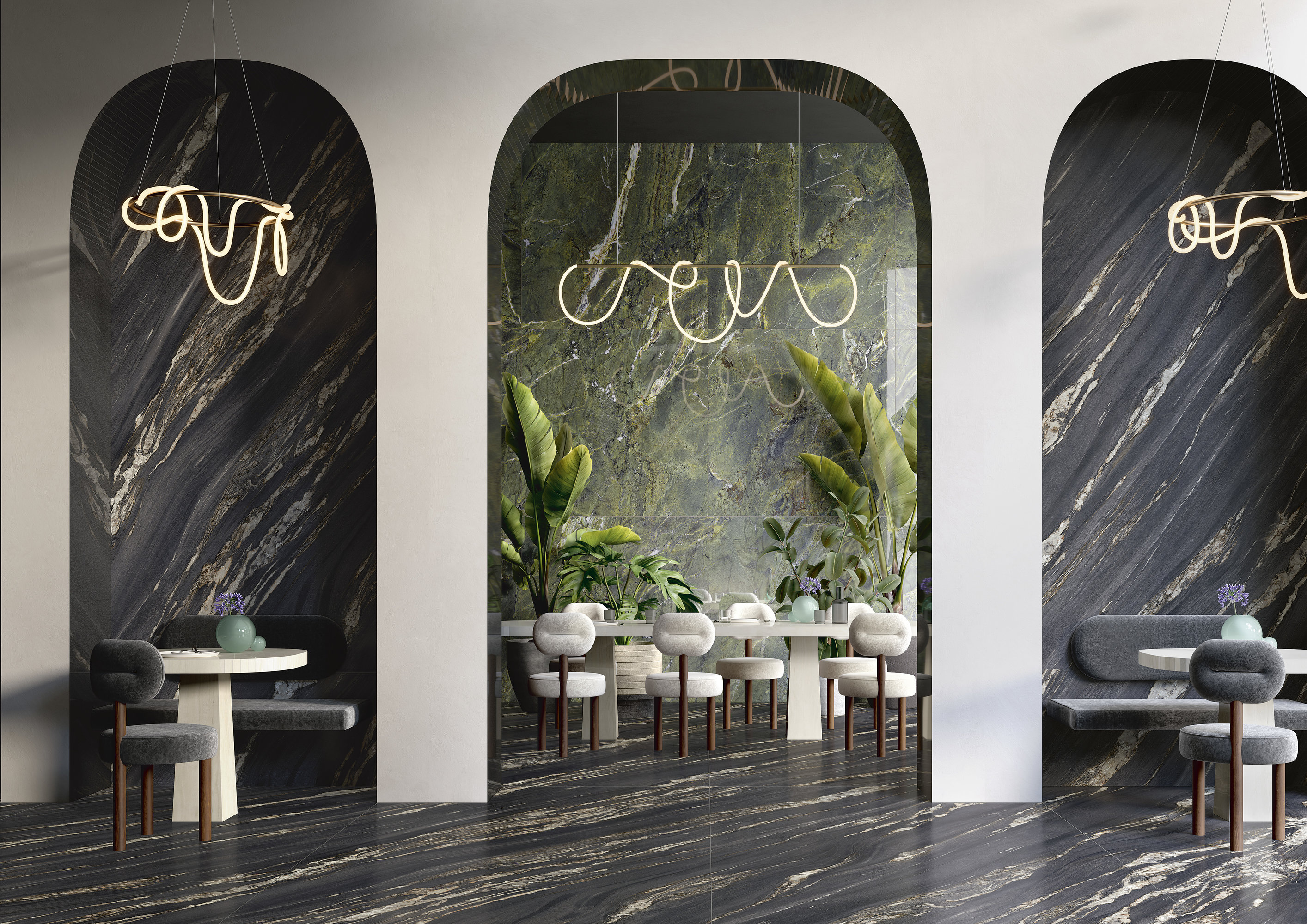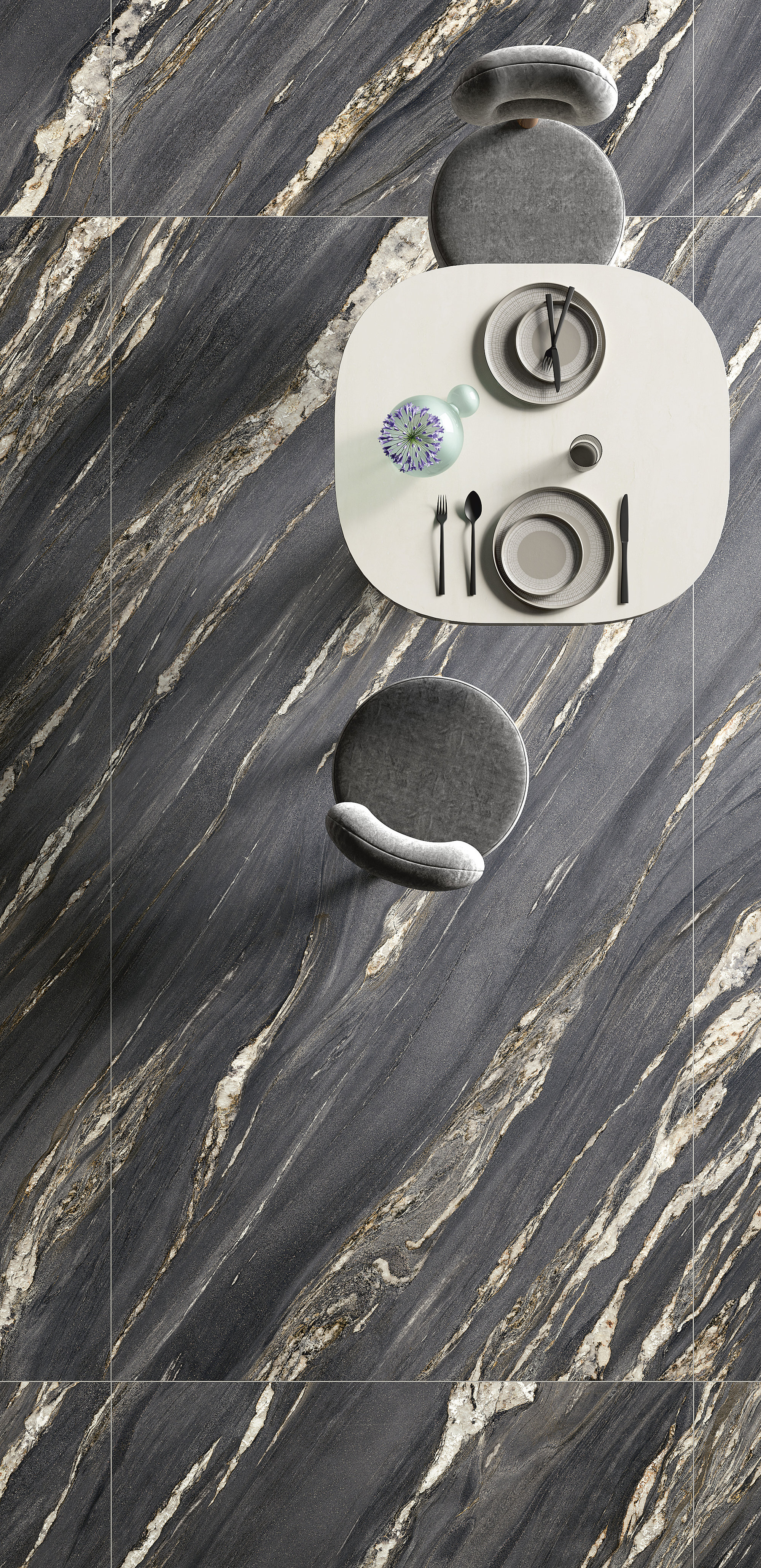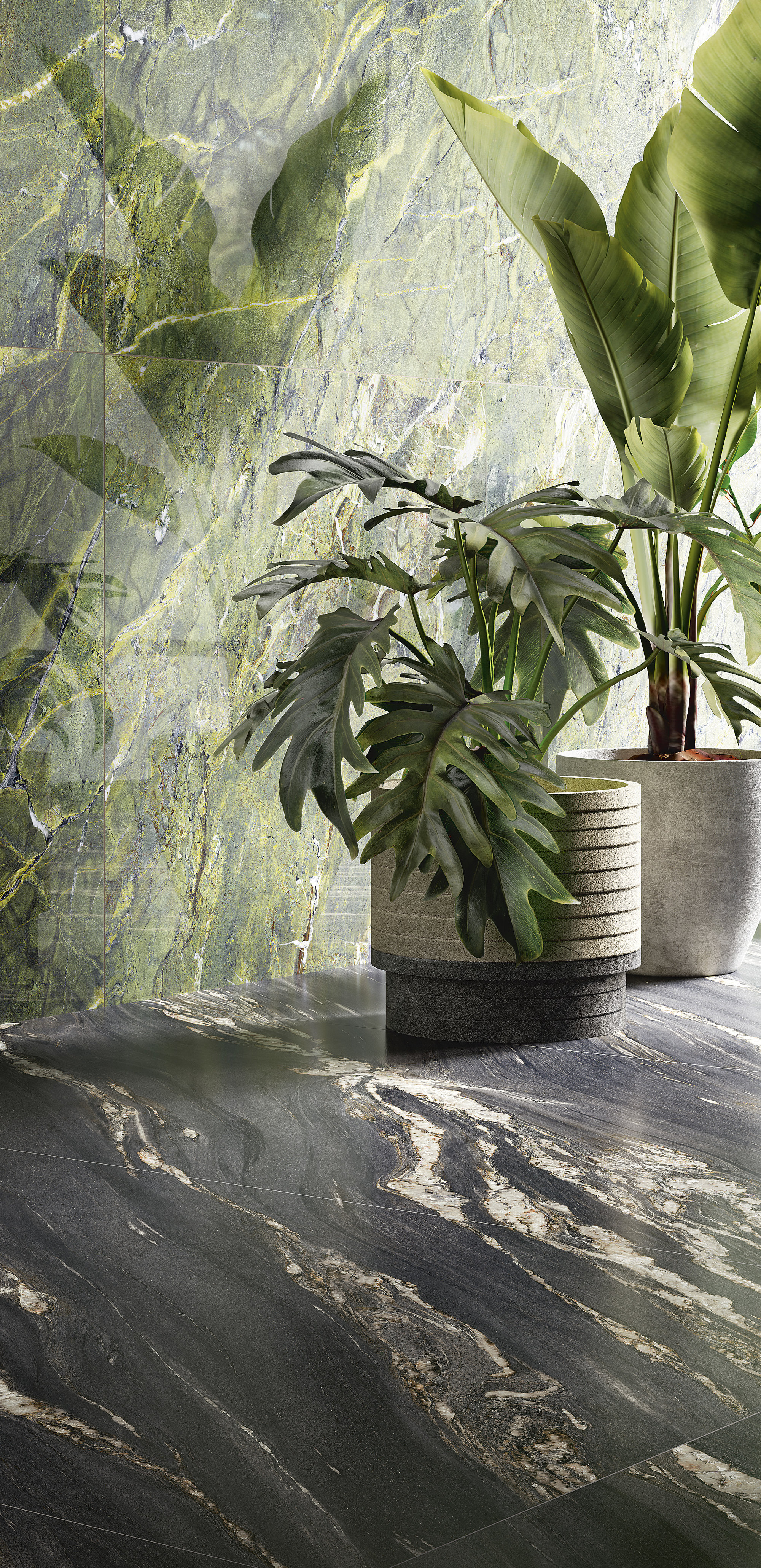 Ähnlich einer Theaterkulisse setzt der Marmor Werke in Szene, die von einer kräftigen dekorativen Glut erleuchtet werden. Auf der Oberfläche erblühen abwechselnd flammenähnliche, bräunlich-goldene Mineral-Arabesken, deren wellenförmige Bewegung dem dramatisch-geheimnisvollen Mineralienmantel Wärme und Bedeutung verleiht.