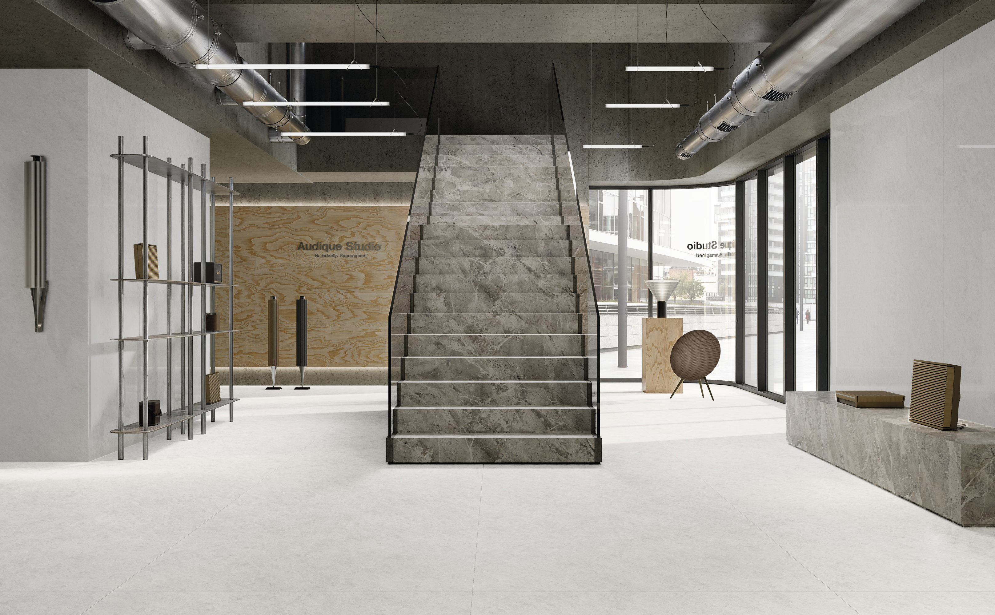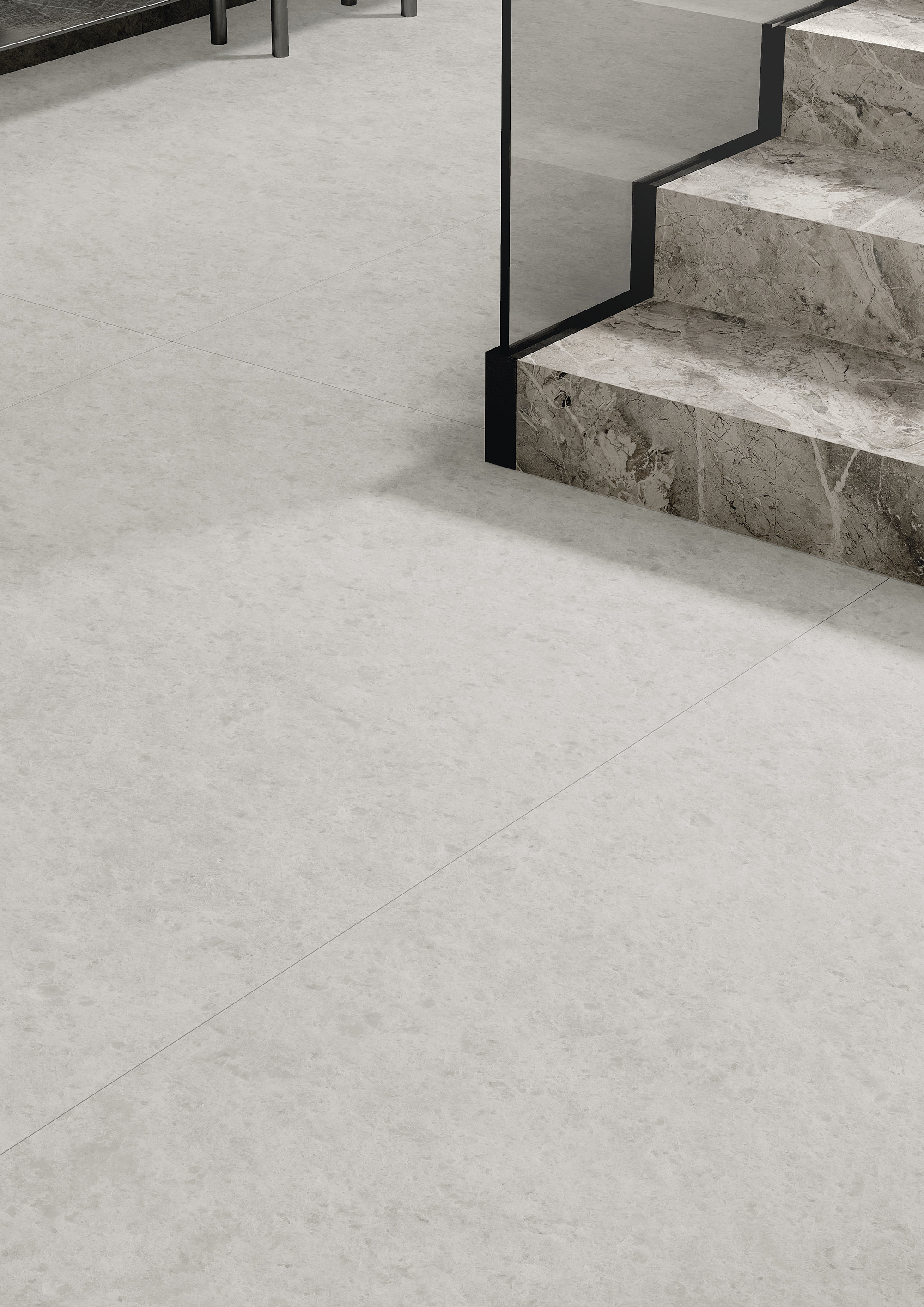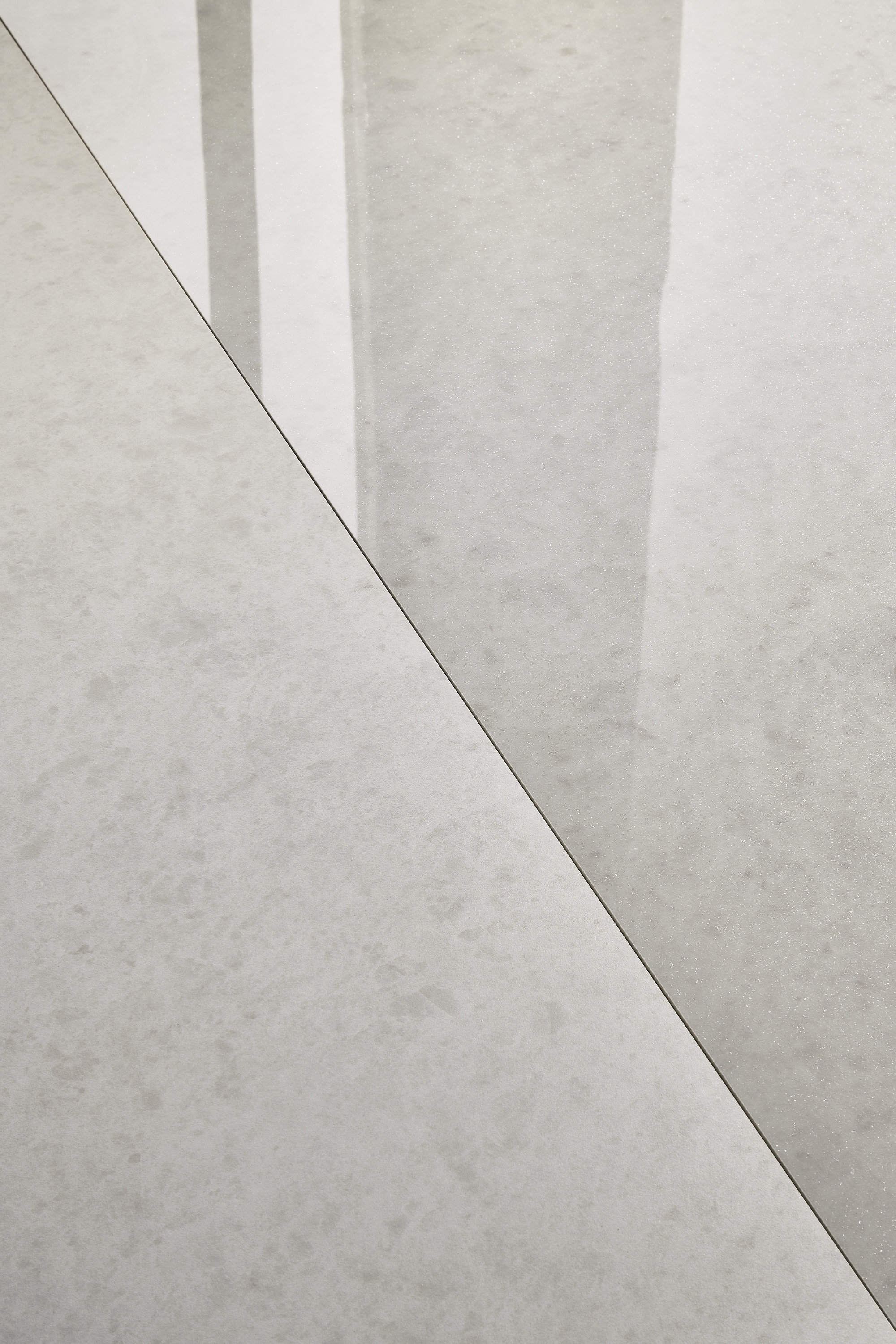 Eine von natürlichem Opal inspirierte Oberfläche, gekennzeichnet durch einen hellweißen Hintergrund mit zarten Farbtönen von Grau bis sanftem Blau. Die kristalline Textur vermittelt ein Gefühl von Tiefe, das an die teilweise Transparenz und die Reflexionen des Originalsteins erinnert. Erhältlich in der Glint-Oberfläche, glänzend mit kleinen, dezenten Lichteinschlüssen, die die Brillanz erhöhen, und in der Feel-Oberfläche, homogen und samtig mit gleichmäßig matter Wirkung. Diese Oberfläche im Maximum-Format wird mit wasserbasierter Technologie hergestellt: hervorragende ästhetische Wirkung, hohe Bilddefinition und Materialeffekt, alles im Zeichen der ökologischen Nachhaltigkeit.