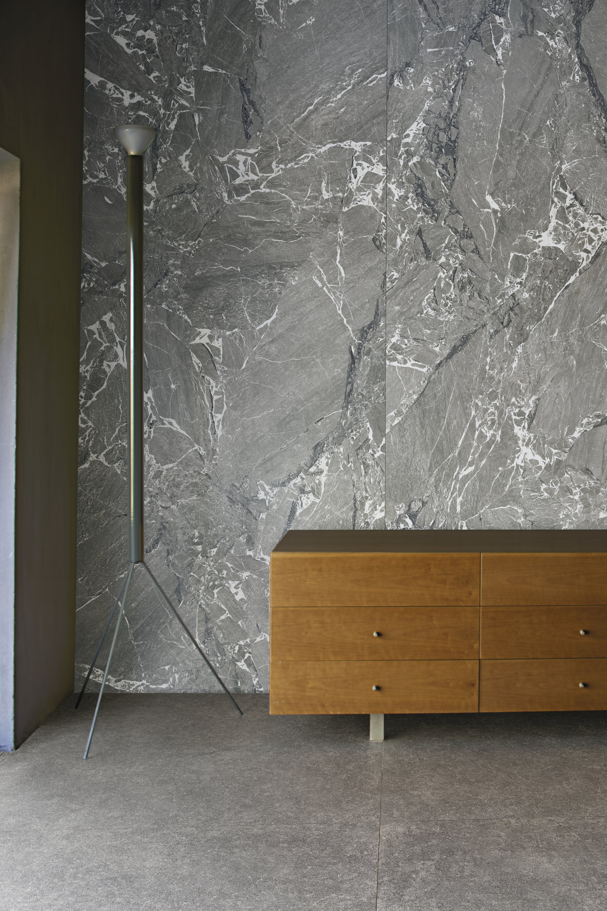 Oberfläche, die die Tradition der arabesken Marmore neu interpretiert, mit einer intensiven Struktur, durchzogen von dunklen Adern, die sich über einen hellgrauen Hintergrund bewegen. Die Wirkung ist dynamisch und lebendig und verleiht den Räumen Rhythmus, ohne das Gleichgewicht zu verlieren. Erhältlich in 8 mm Keramikformaten und als Maximum-Platte 270×120 cm, in den Ausführungen Natural und Natural Plus, schöpft Arabescato Grigio seine Stärke aus der Fähigkeit, Klassik und Moderne zu vereinen und wird so zur idealen Basis für alle, die Eleganz und Bewegung zum Ausdruck bringen möchten. Diese Oberfläche im Maximum-Format wird mit wasserbasierter Technologie hergestellt: hervorragende ästhetische Wirkung, hohe Bildschärfe und Materialeffekt – ganz im Zeichen der ökologischen Nachhaltigkeit.