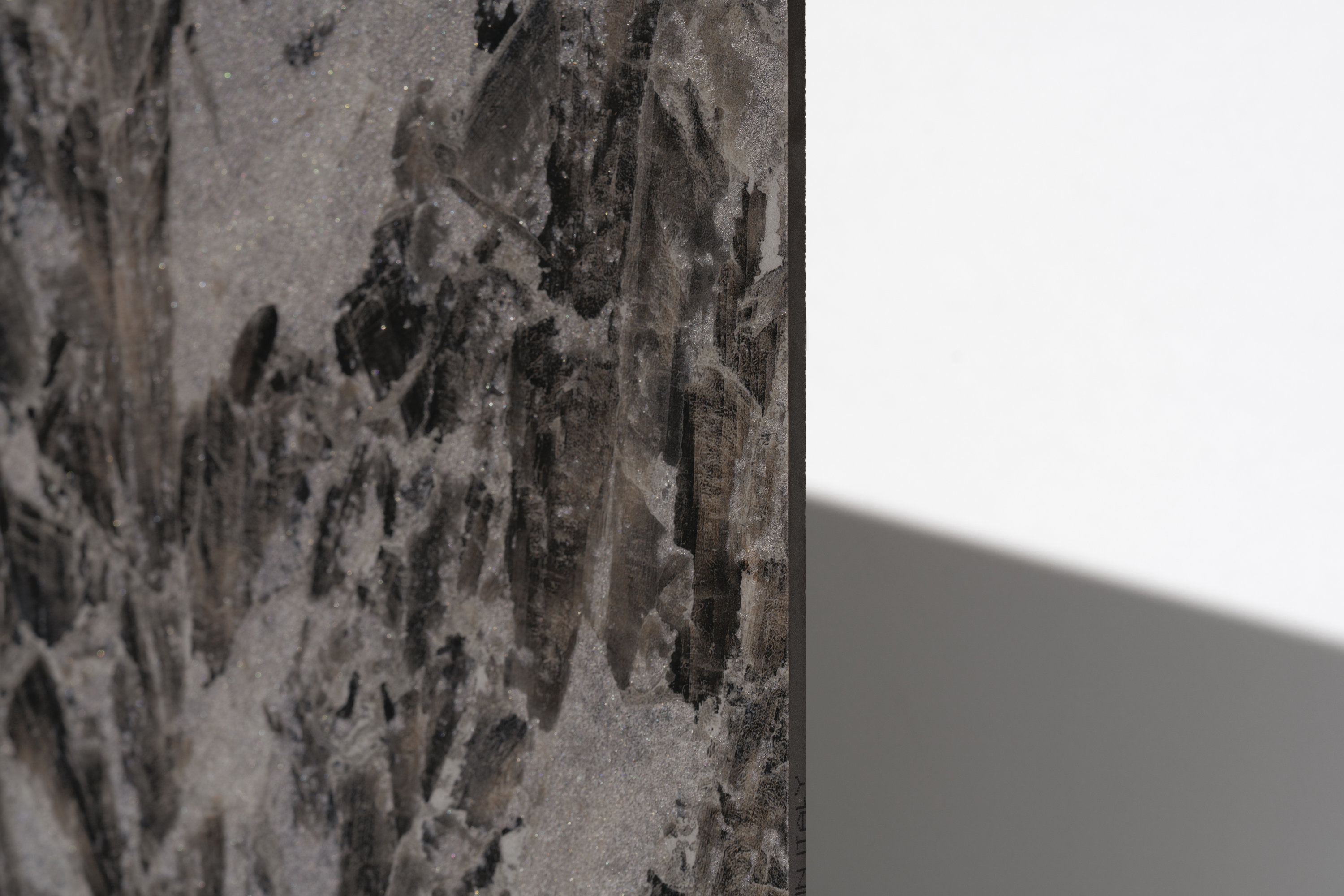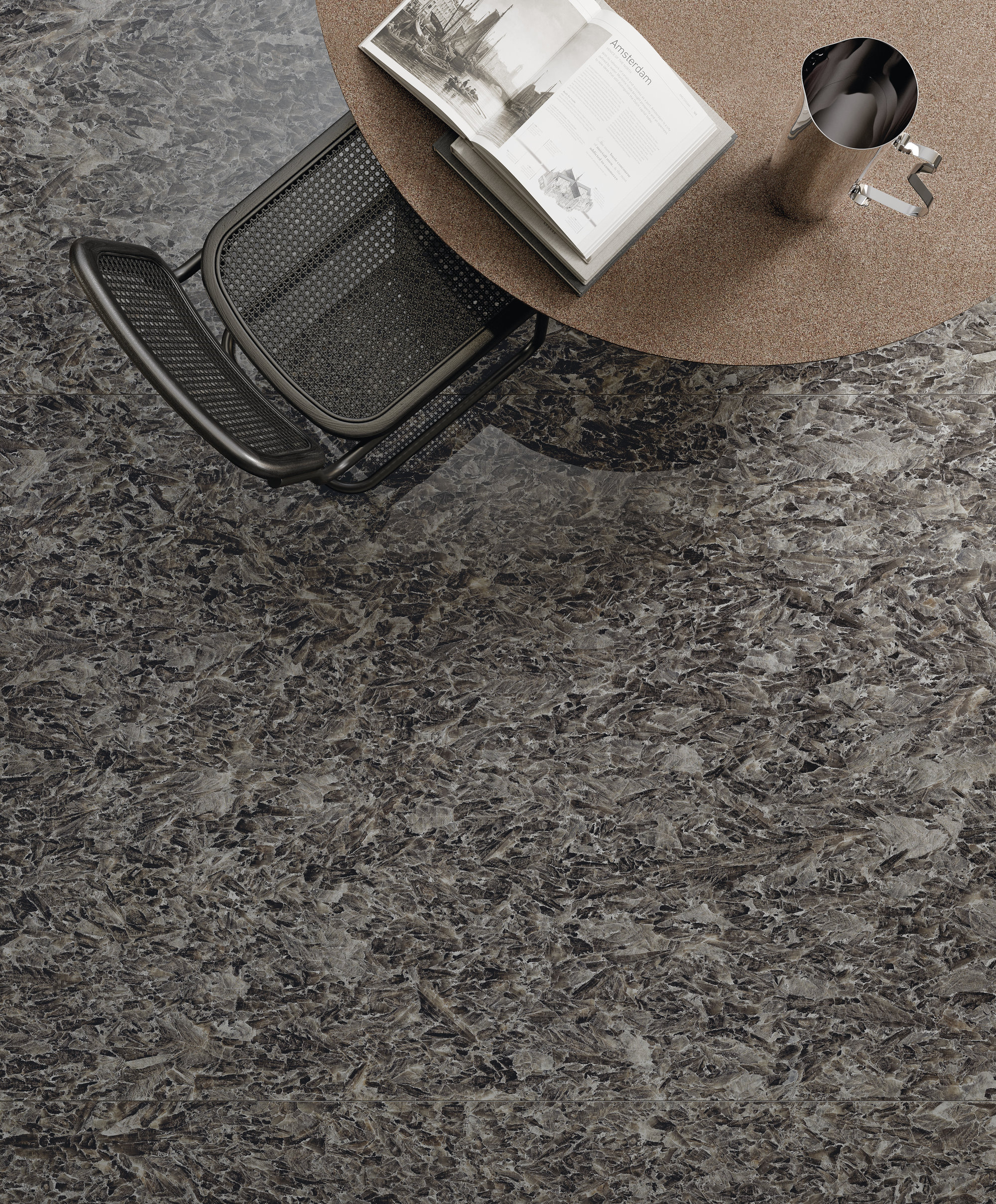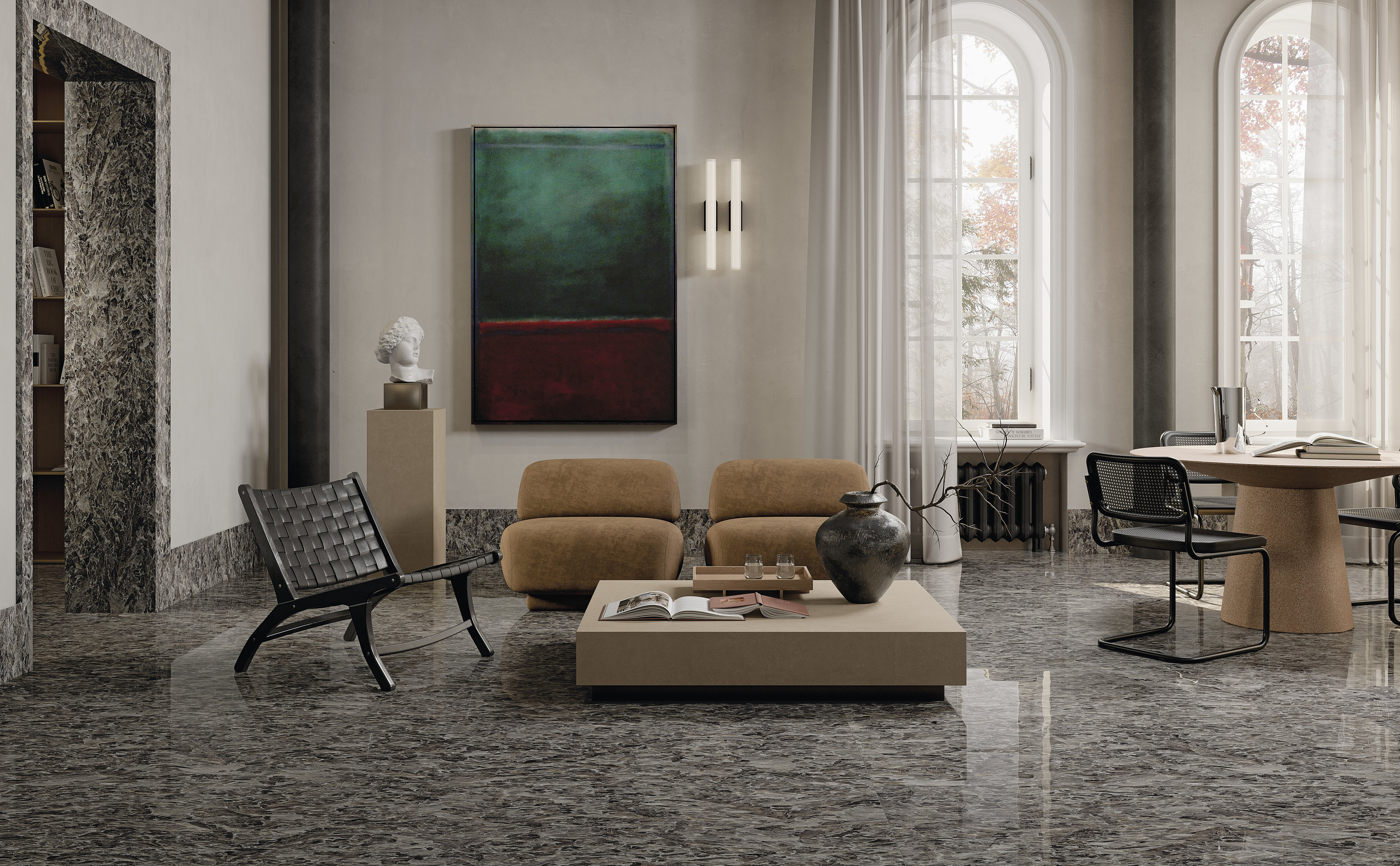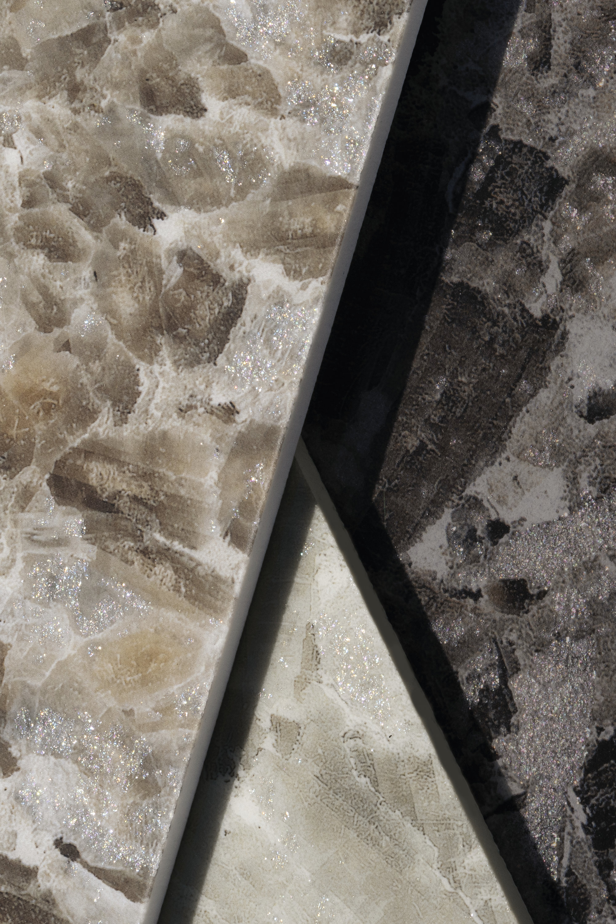 Das Schwarz wird von helleren, nuancierten Einsätzen erhellt, die den Räumen Eleganz und einen Hauch von Strenge verleihen. Die Oberflächen sind dank der kristallinen Lichtbrechungen optisch einhüllend und überraschen mit ihren grafischen Merkmalen, während das exklusive Jewel-Finish dank einer alchemistischen Beziehung zwischen einem schillernden Mineral und einem glasartigen Material die leuchtenden Fragmente hervorhebt und dem keramischen Material einen noch schärferen und intensiveren Effekt verleiht, der eine emotionale architektonische Erfahrung suggeriert.