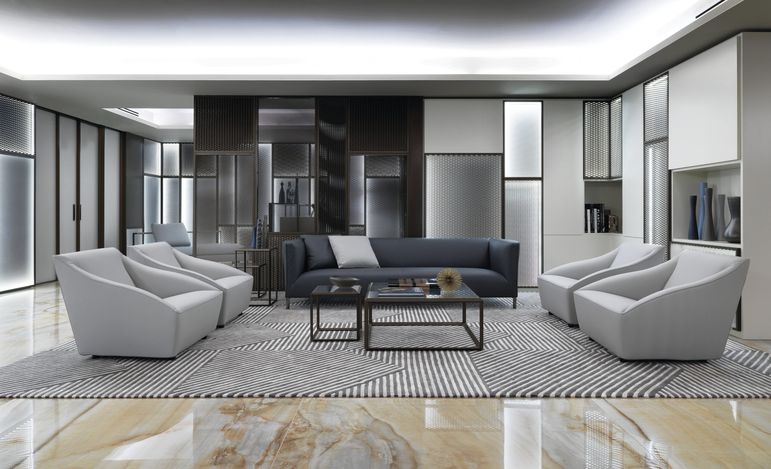 Die Marmi Maximum-Platten (300×150 cm, 6 mm dick) aus Feinsteinzeug verkleiden Lobby, Restaurants und Lounges. Travertino Maximum verleiht der Lobby warme Töne, inspiriert vom Wüstensand, Calacatta Maximum betont die Helligkeit der Restaurants, während Gold Onyx Maximum der Lounge im 32. Stock Exklusivität verleiht. Das Großformat reduziert Fugen, vergrößert Räume und sorgt für visuelle Kontinuität.
