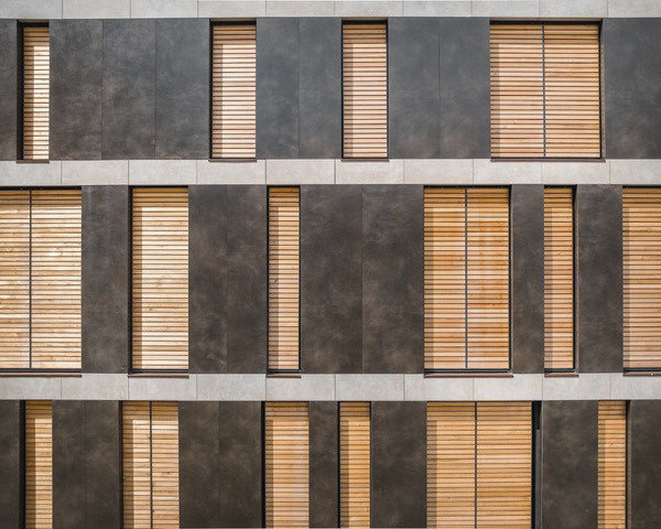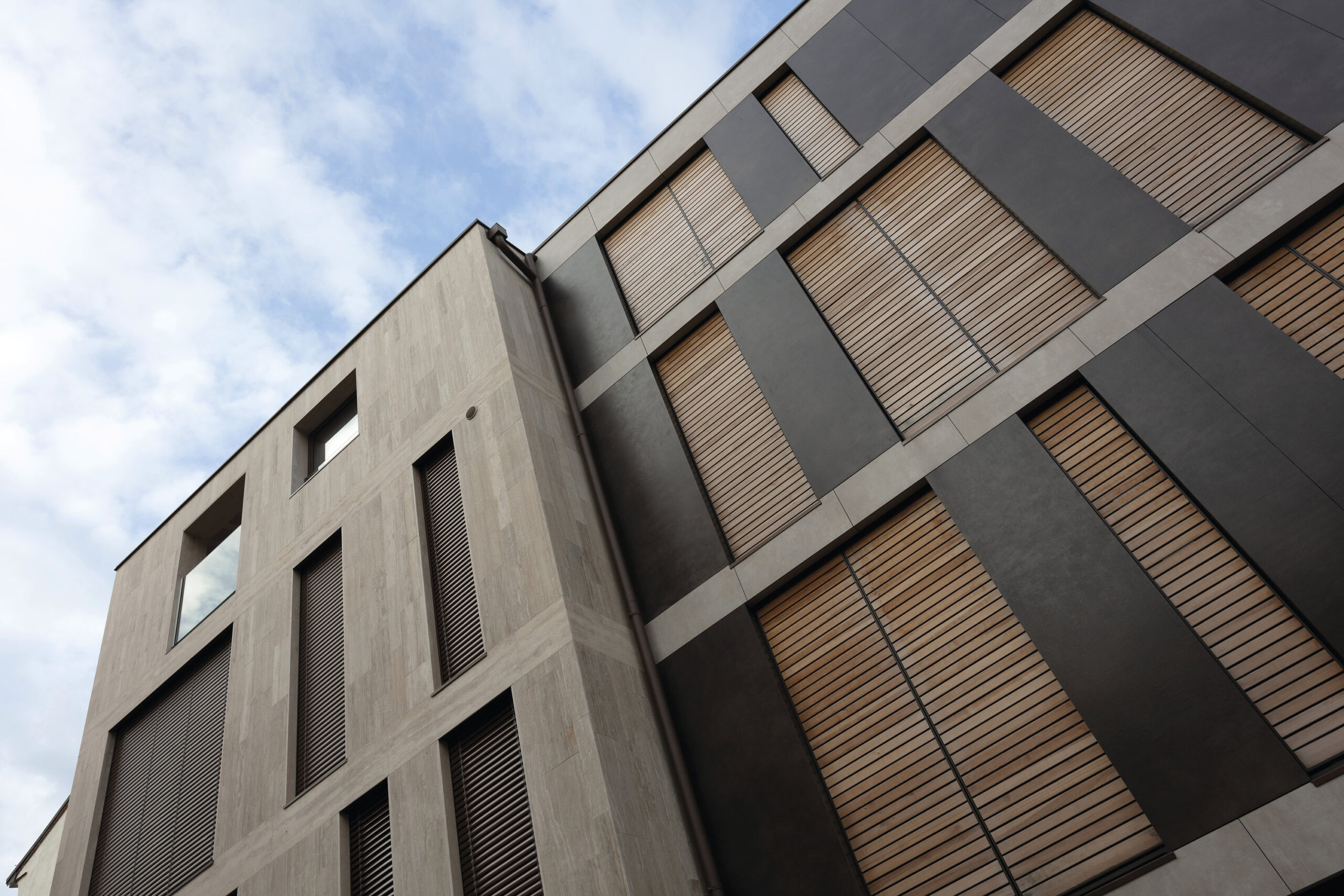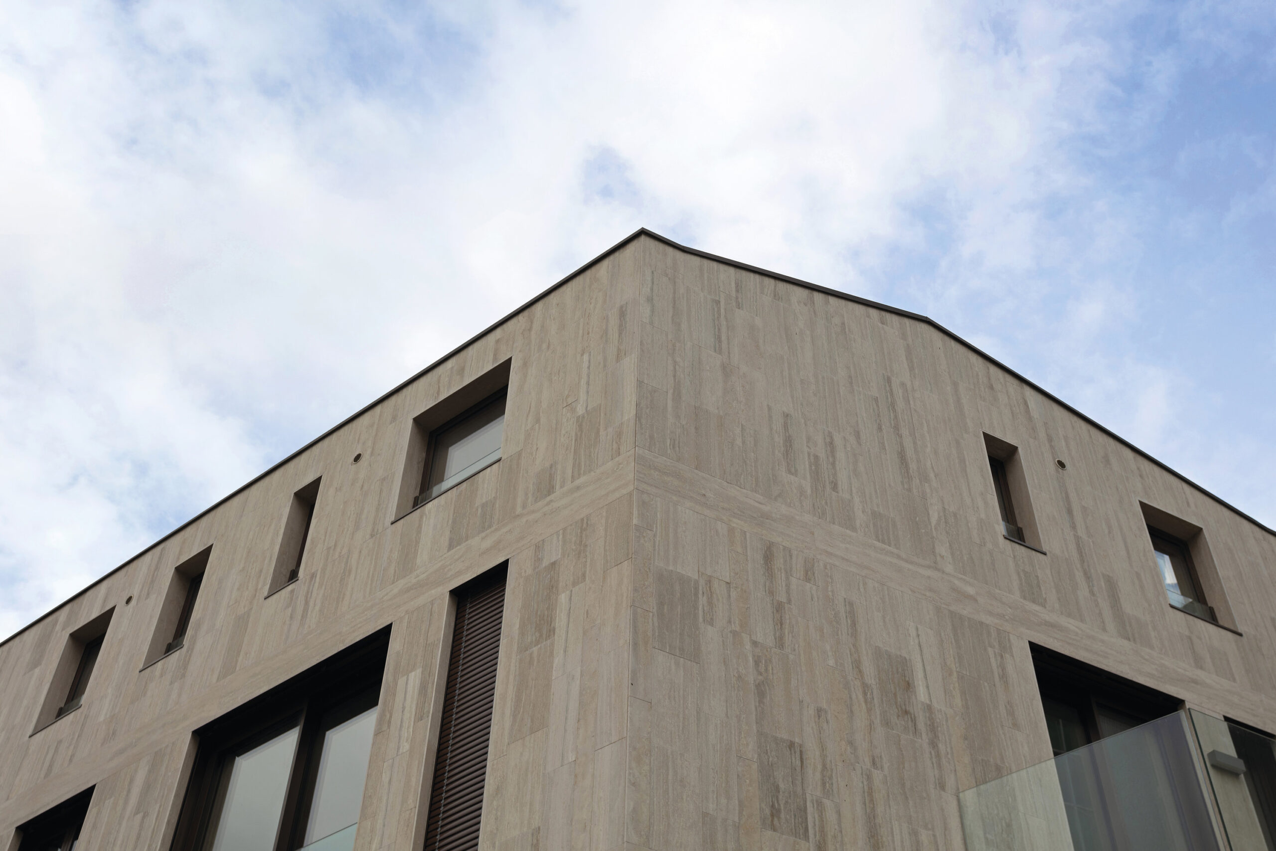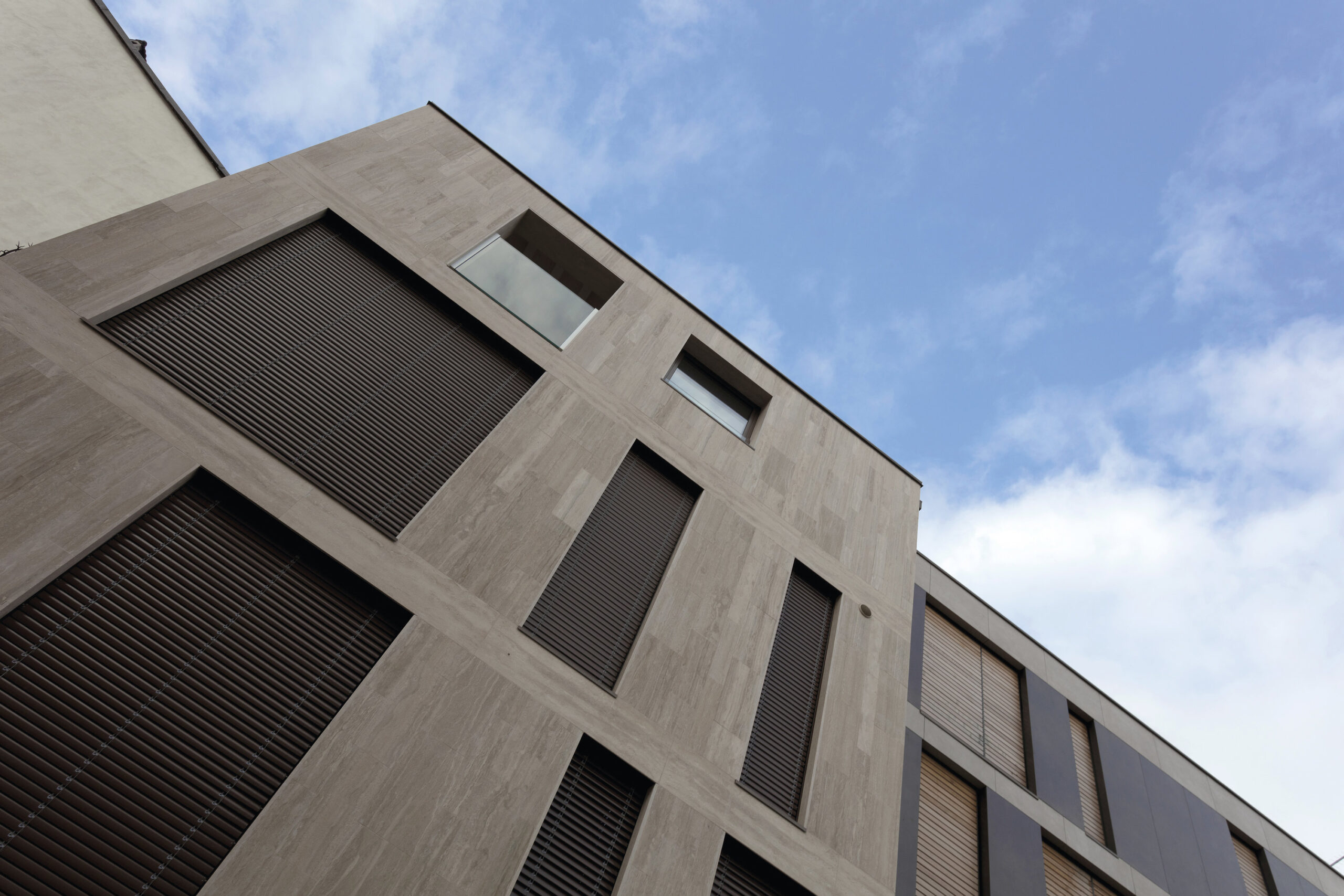 Die Fassade, minimalistisch und frei von überflüssigen Verzierungen, überzeugt durch hochwertige Materialien und Details, wobei Texturen und Oberflächen Licht- und Schattenspiele erzeugen, die die Geometrie des Gebäudes im Tagesverlauf betonen. Höhe und Proportionen sind so abgestimmt, dass sie mit den umliegenden Gebäuden harmonieren und eine städtische Integration ohne Verzicht auf zeitgenössische Gestaltung ermöglichen.