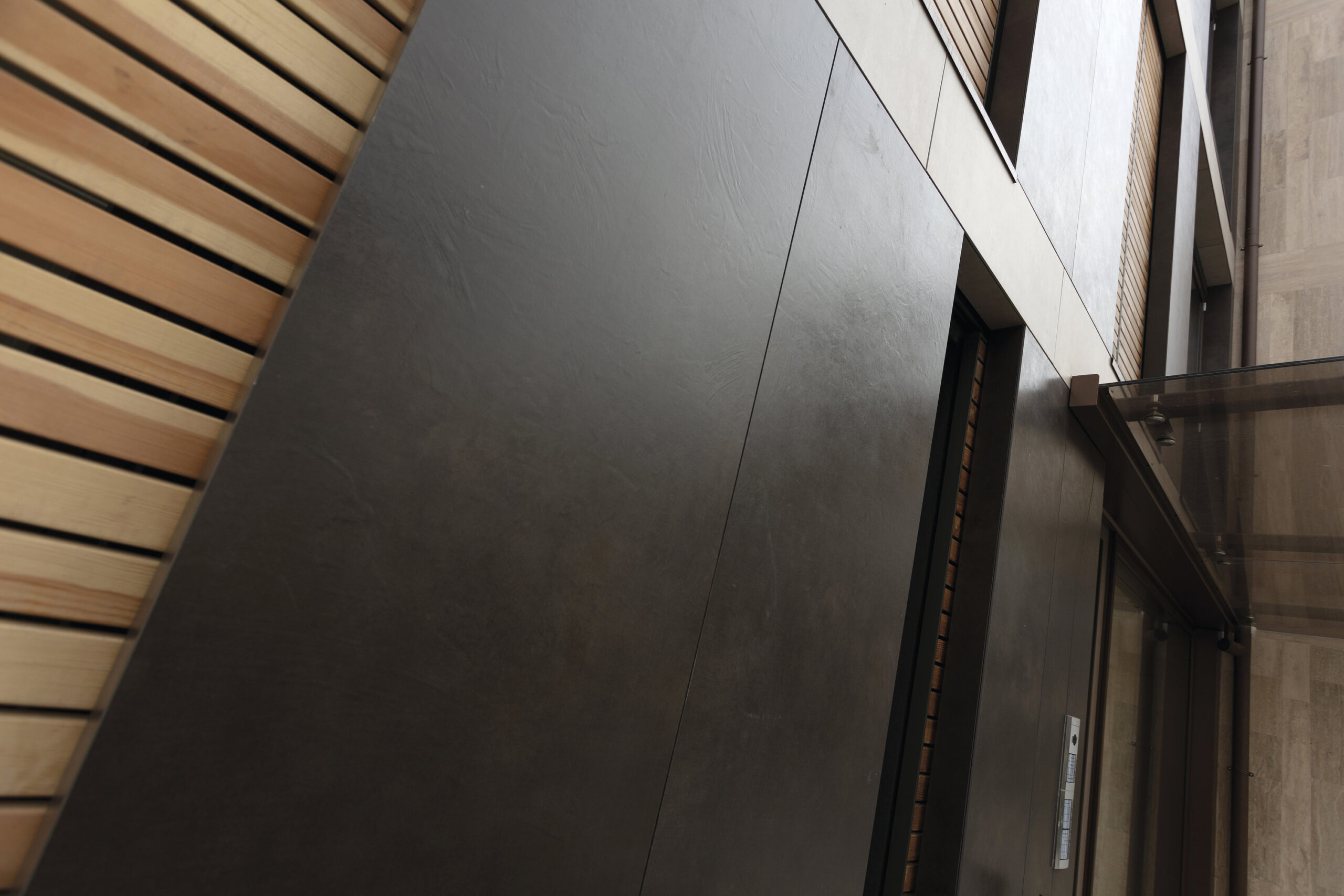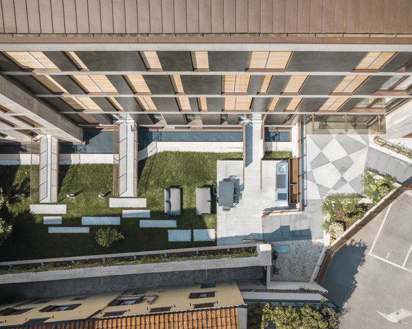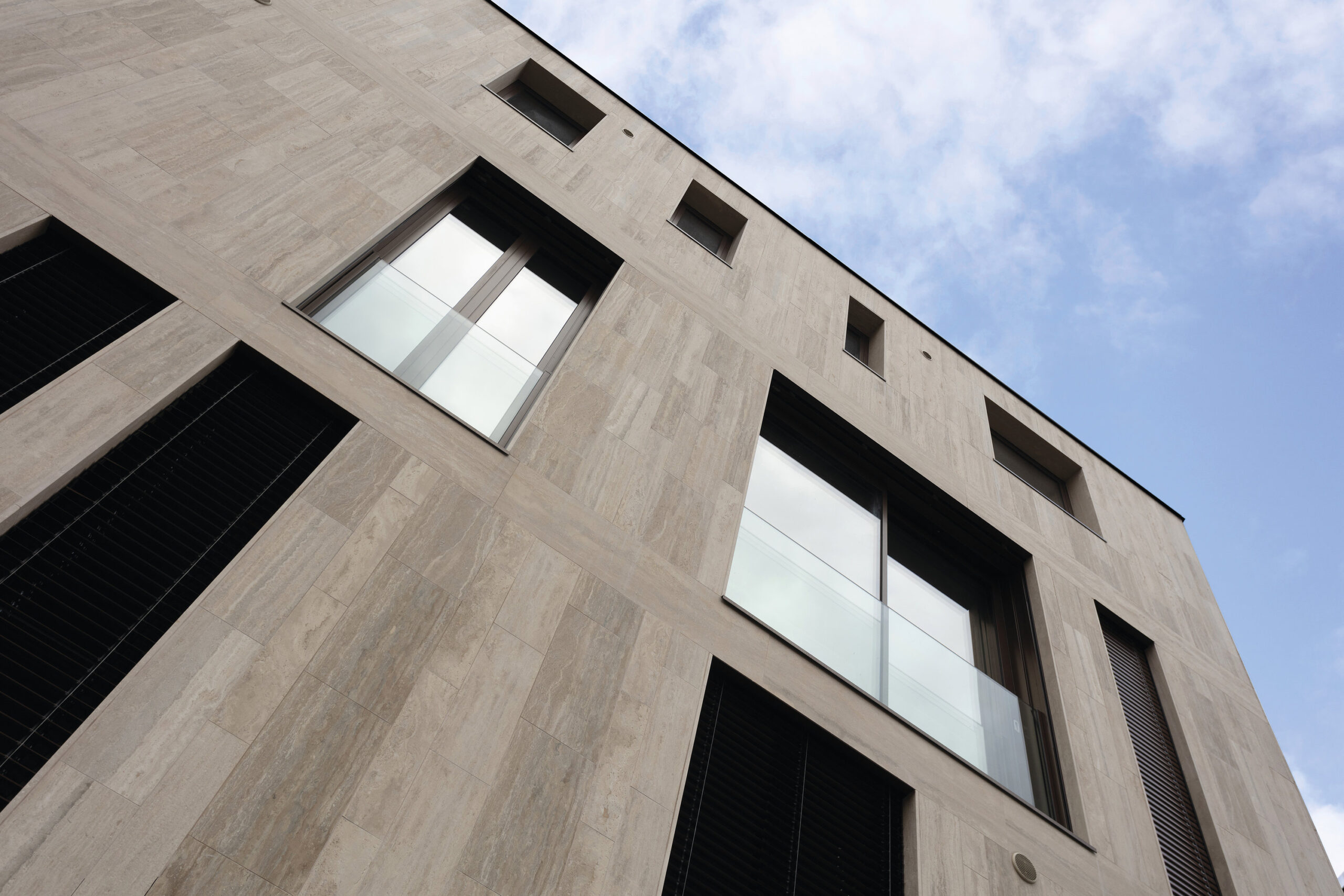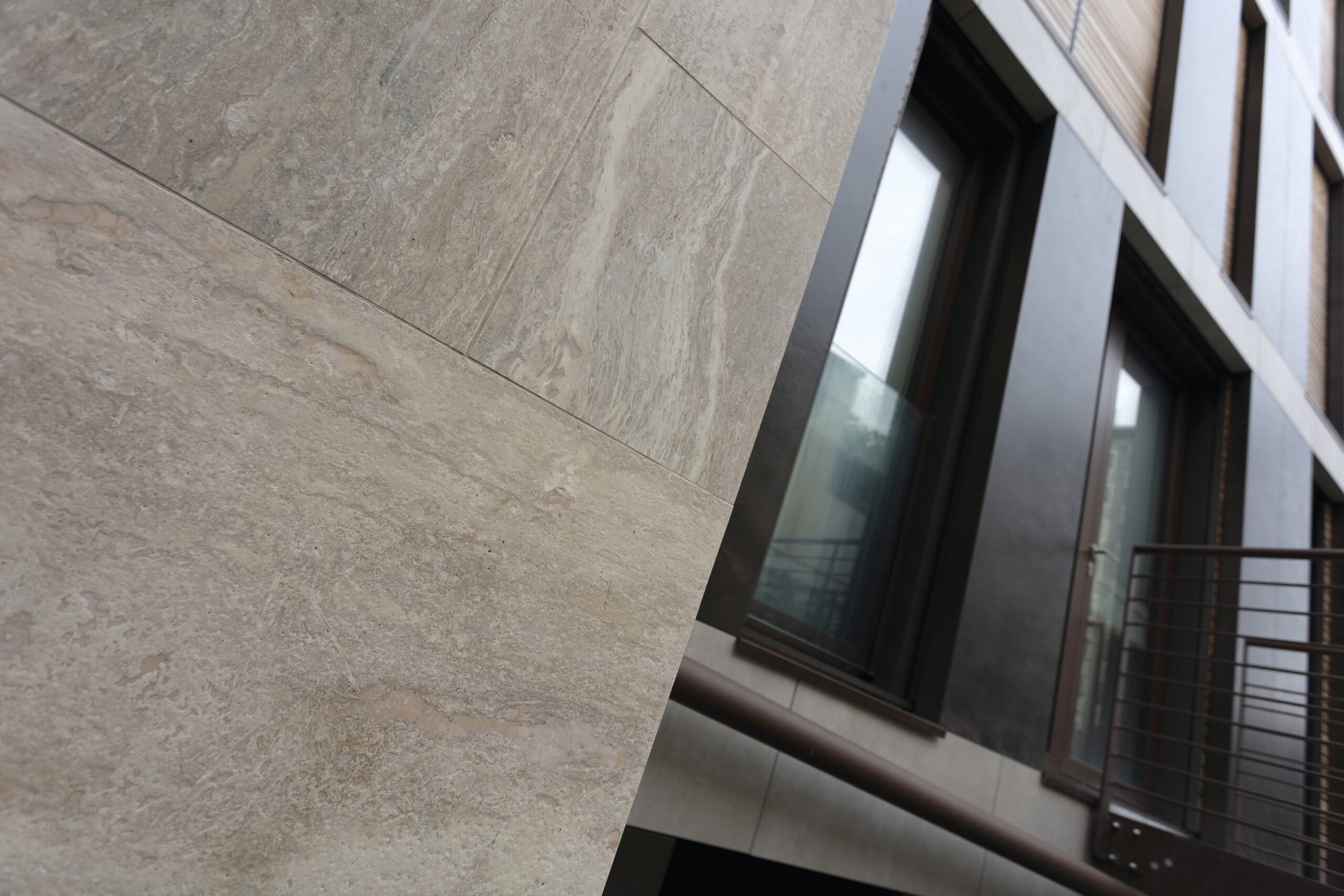 Die Fassade, minimalistisch und frei von überflüssigen Verzierungen, überzeugt durch hochwertige Materialien und Details, wobei Texturen und Oberflächen Licht- und Schattenspiele erzeugen, die die Geometrie des Gebäudes im Tagesverlauf betonen. Höhe und Proportionen sind so abgestimmt, dass sie mit den umliegenden Gebäuden harmonieren und eine städtische Integration ohne Verzicht auf zeitgenössische Gestaltung ermöglichen.