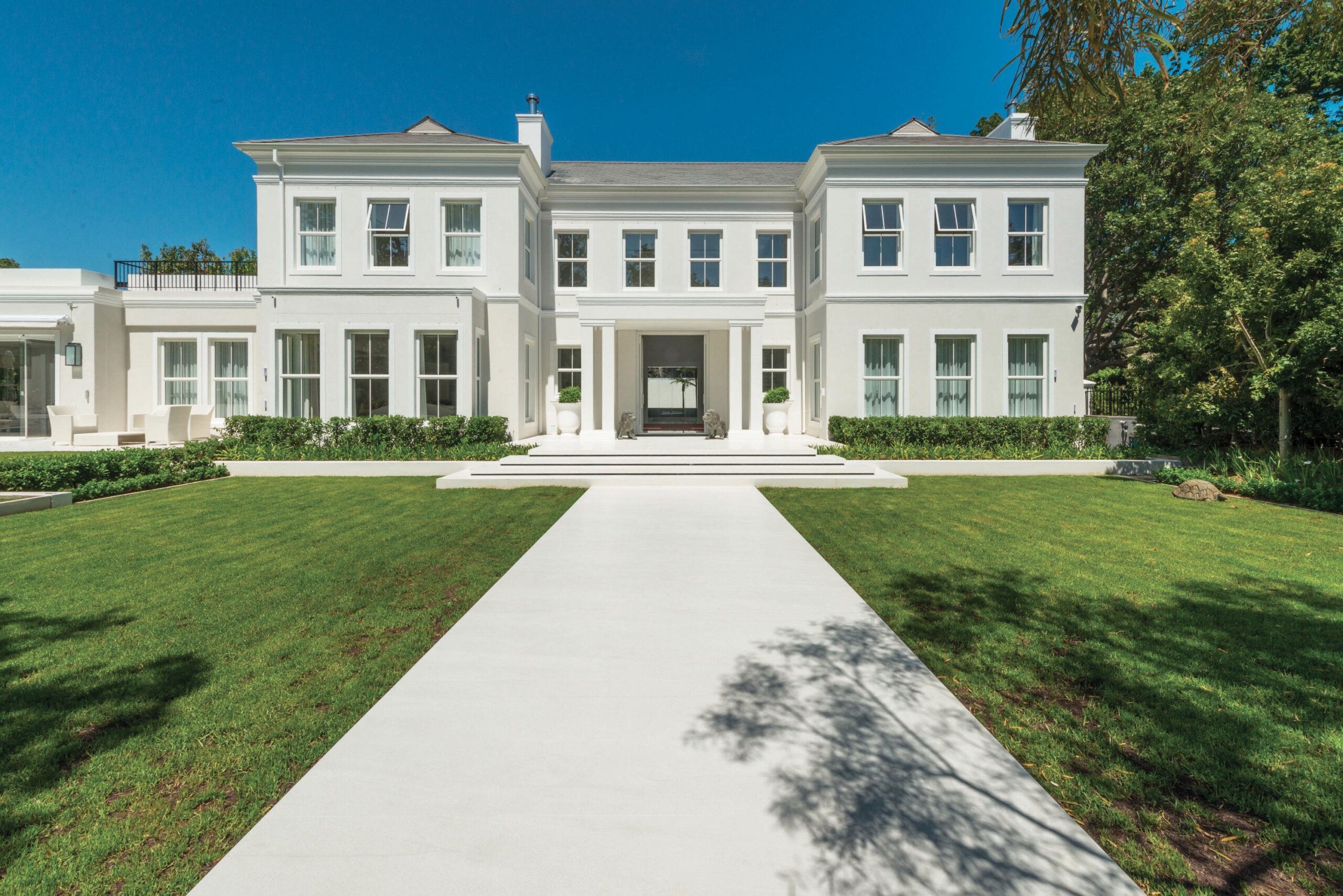 Nur wenige Kilometer vom Zentrum Kapstadts entfernt wurde eine kolonialstil-Villa mit eleganten Farbtönen und klaren Linien einer zeitgenössischen Renovierung unterzogen. Eingebettet in das malerische Constantia Valley, das sich bis zu den südöstlichen Hängen des Table Mountain Nationalparks erstreckt, verfügt die Residenz über einen Swimmingpool, der von einer Sonnenterrasse und einem gepflegten Garten umgeben ist.