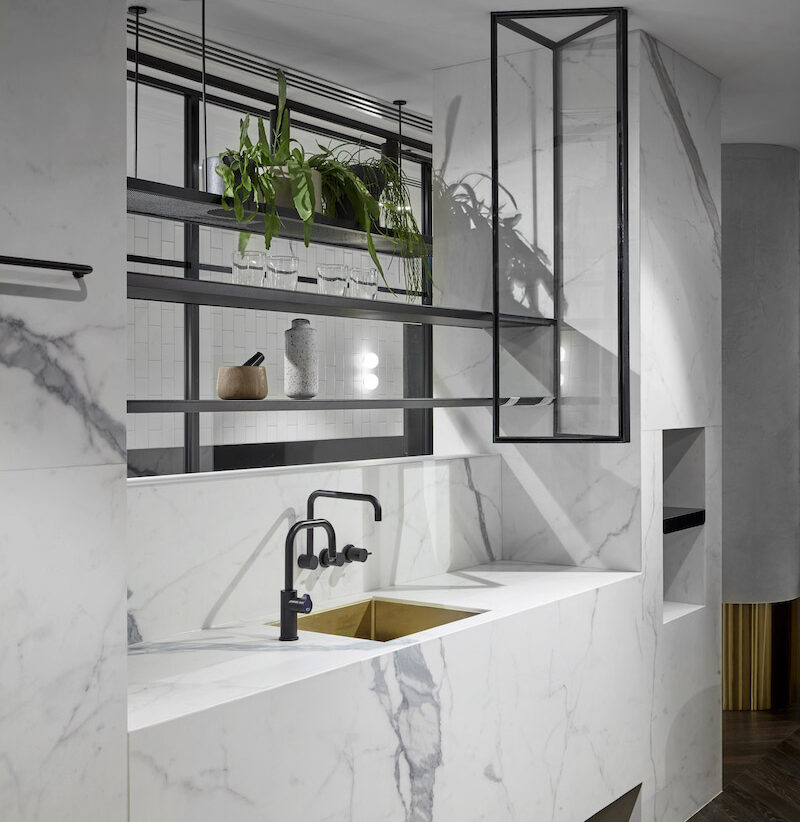 Ein besonderes Highlight ist die maßgefertigte Küche, entworfen und umgesetzt in Zusammenarbeit mit Artedomus, ergänzt durch Calacatta Statuario Maximum Oberflächen von Fiandre. Artedomus kümmerte sich um jedes Detail der Möbelgestaltung und -fertigung, während die Fiandre-Platten Eleganz, Langlebigkeit und eine visuell raffinierte Oberfläche bieten, die sich harmonisch in den anspruchsvollen Stil der Lounge einfügt.